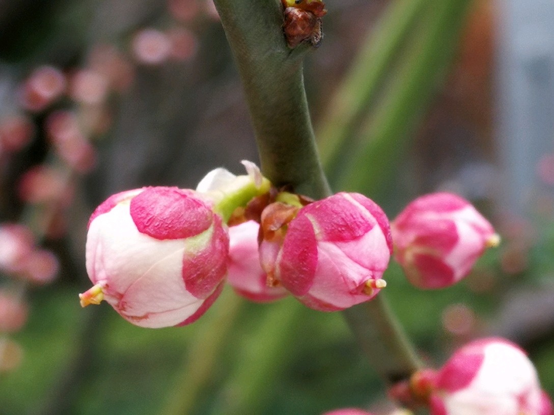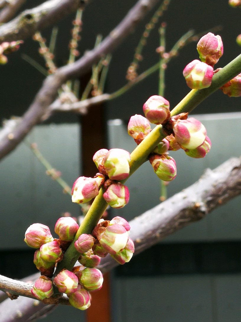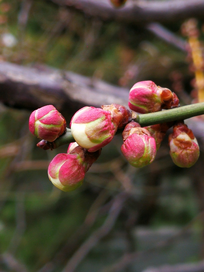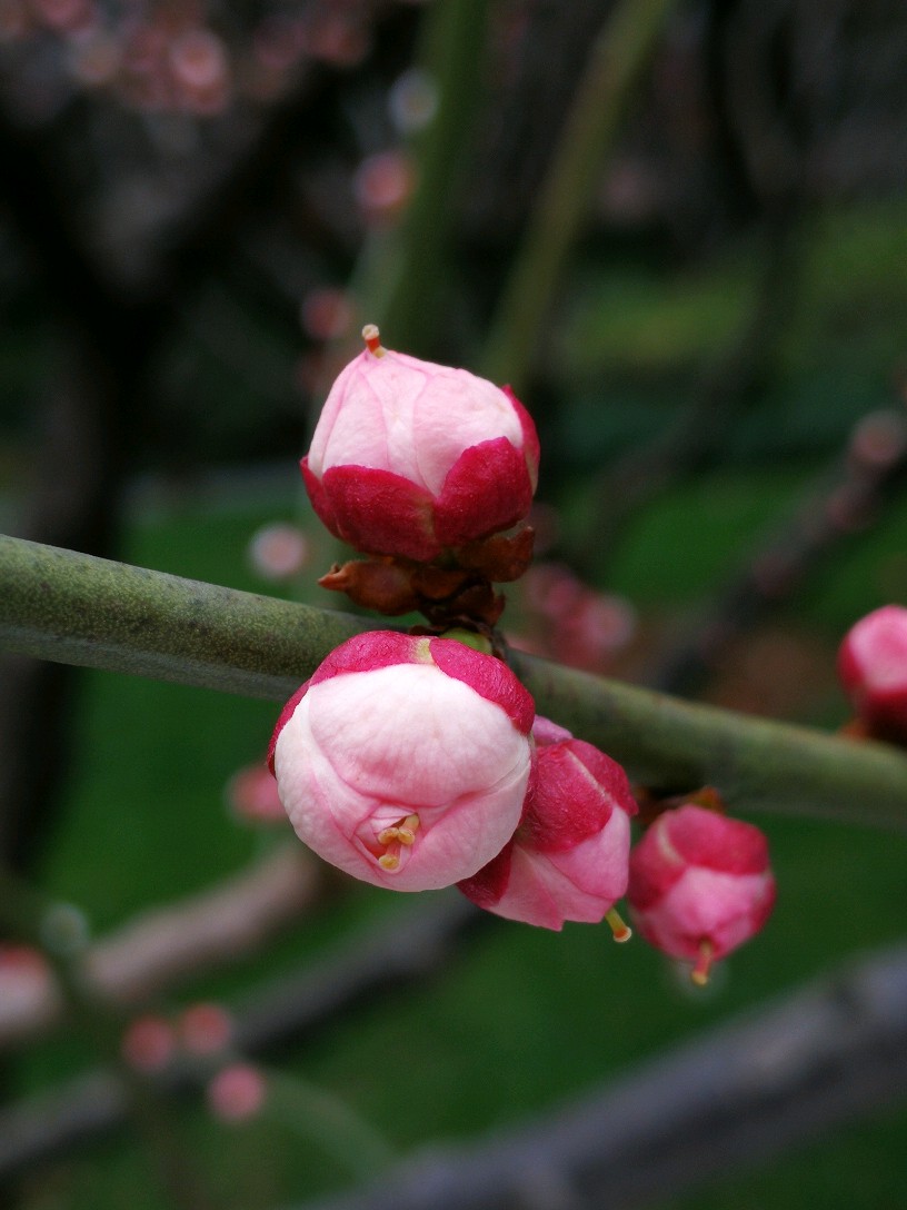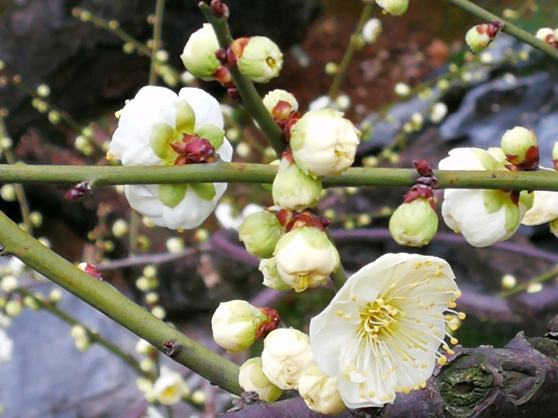 一一观赏过去,其实大多数的梅花都还没有开,但尚未开放或者待放的花苞,也更有别具一格的欣赏亮点,一个个鼓鼓胀胀,把花苞的前端撑裂开了口,急着要把春来报的样子,煞是可爱,因此就多多地拍了些照片。
