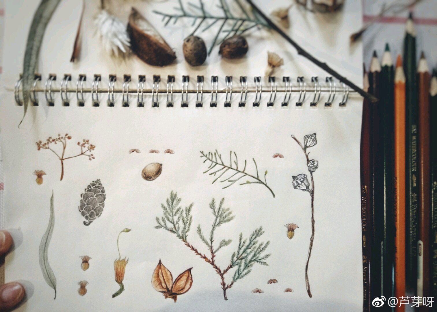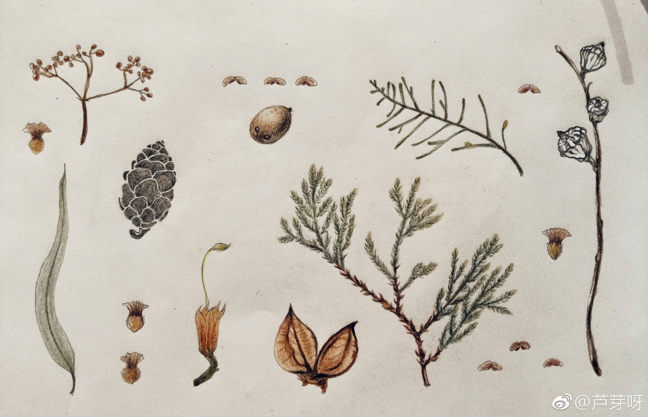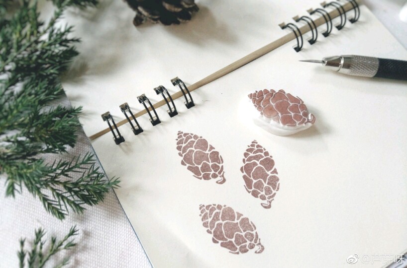 我想说植物于生活的可能性 去年初冬捡到这些植物 画了出来 很喜欢松果 于是刻成了印章
