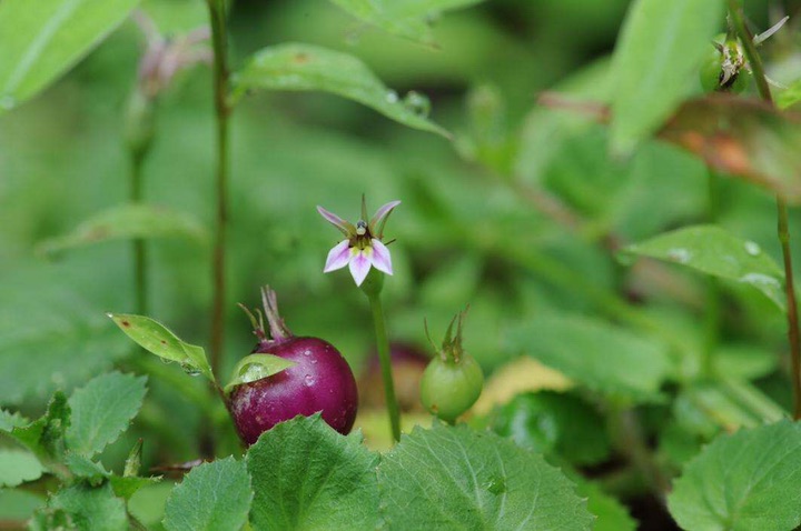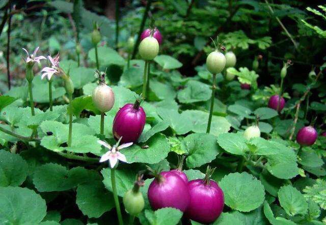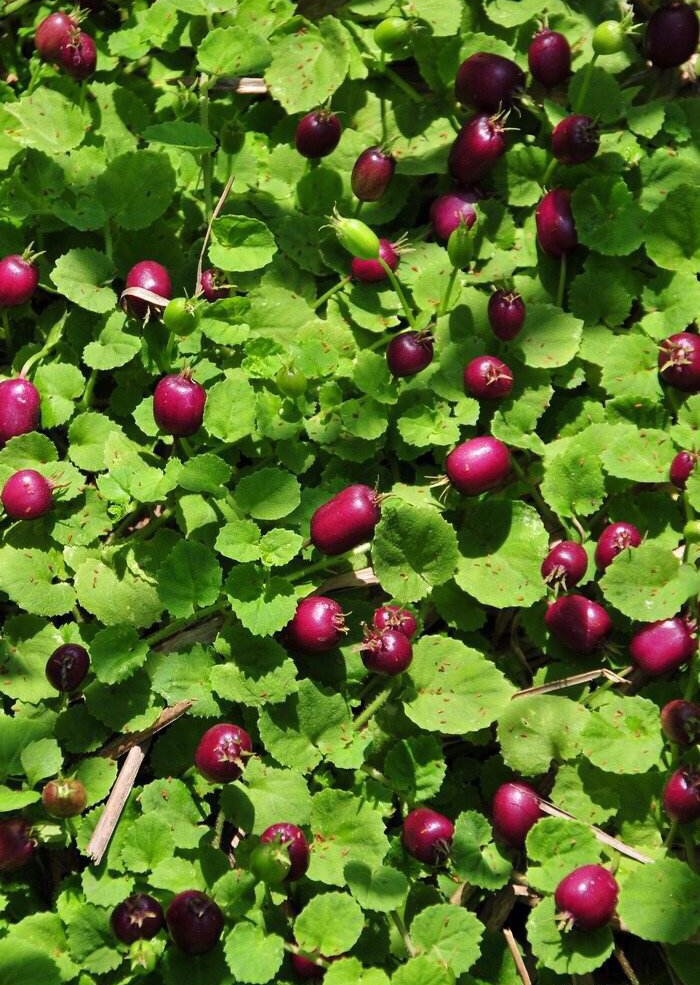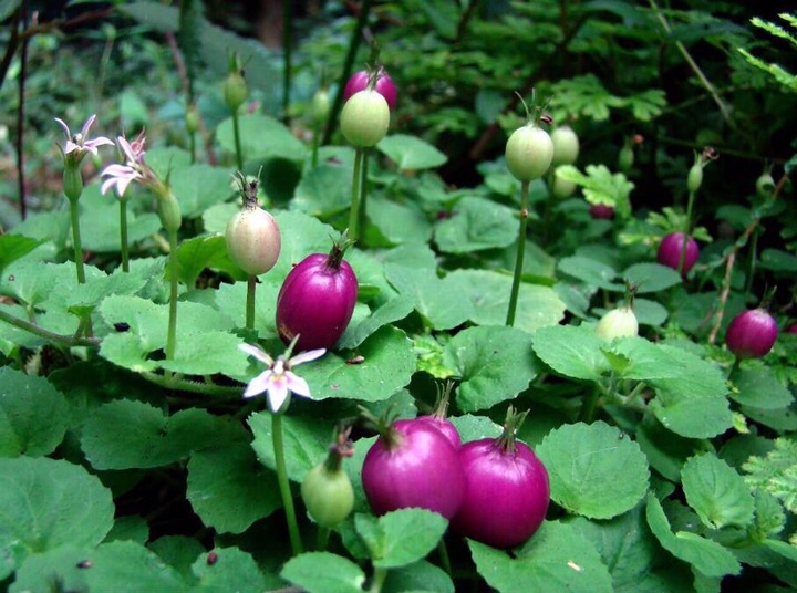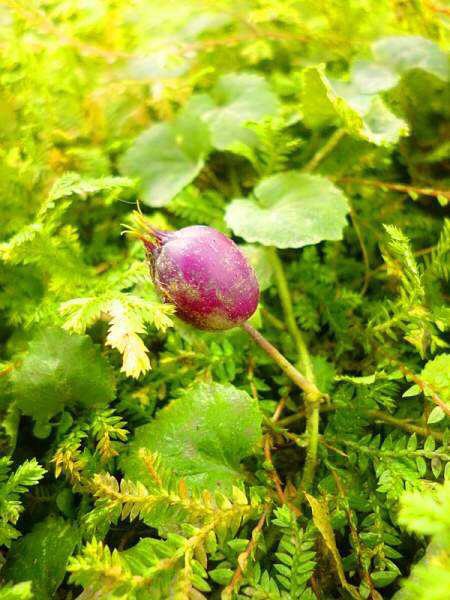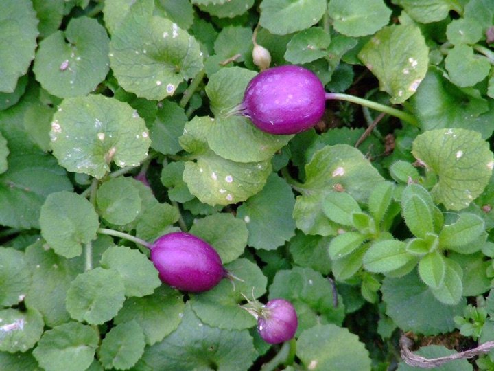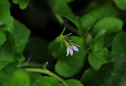 铜锤玉带草别名:地钮子、地茄子、地浮萍铜锤玉带草 一年生匍匐纤细小草本, 平卧地表, 长达45cm(厘米), 须根多, 黄色, 茎绿色, 略呈方形, 有细柔毛, 节下生根.叶互生, 圆形至心状卵圆形, 长1~1.2cm(厘米), 宽1~1.2cm(厘米), 基部心脏形, 先端钝, 边缘钝锯齿, 表面绿色, 背面淡绿色, 两面均有短毛, 基脉5~7条.花淡紫色, 单生叶腋而与叶对生, 花梗长1~2cm(厘米), 萼5裂, 边缘有刺毛, 花冠左右对称, 2唇形, 雄蕊5枚, 子房下位, 2室.浆果椭圆形, 紫蓝色, 有宿萼.