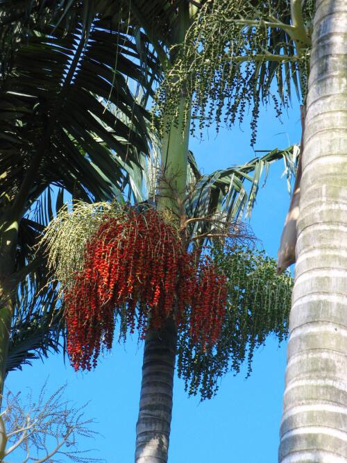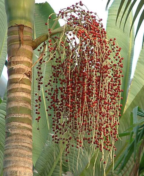 假槟榔(学名:Archontophoenix alexandrae (F. Muell.) H. Wendl. et Drude)是棕榈科,假槟榔属乔木状植物,高可达25米,茎圆柱状,叶羽状,生于茎顶,羽片线状披针形,缘或有缺刻,叶片上面绿色,背面被灰白色鳞秕状物,中脉明显;叶鞘绿色,花序生于叶鞘下,呈圆锥花序式,下垂,花雌雄同株,白色;雄花萼片三角状圆形,花瓣斜卵状长圆形,雌花萼片和花瓣圆形,果实卵球形,红色,种子卵球形,胚乳嚼烂状,胚基生。4月开花,4-7月结果。