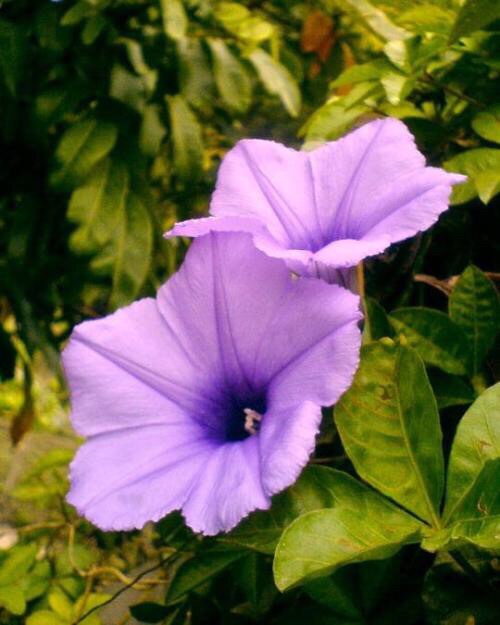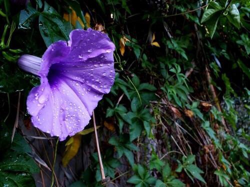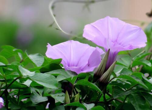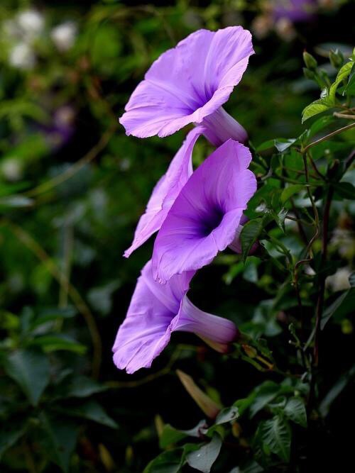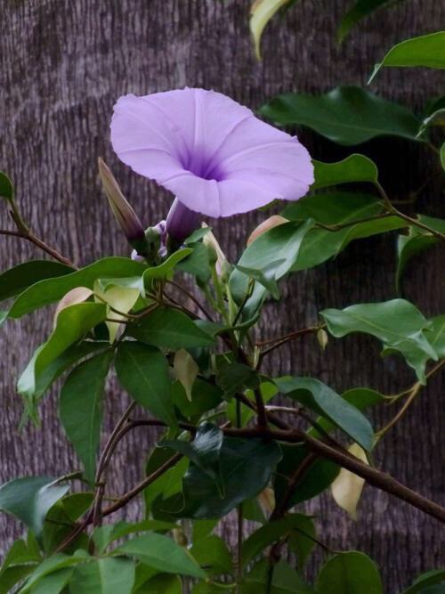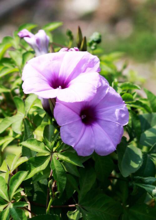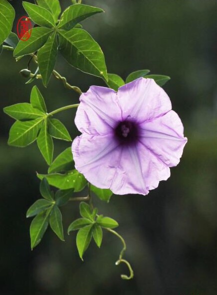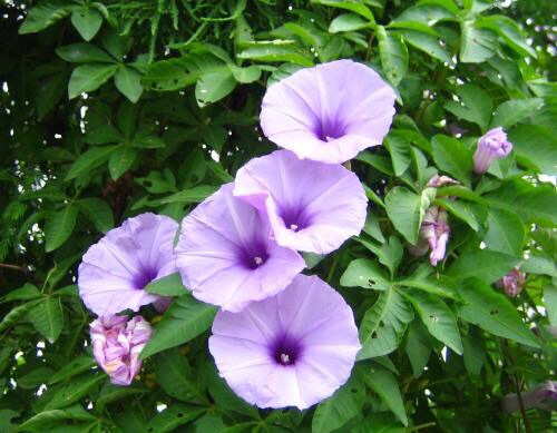 五爪金龙(学名:Ipomoea cairica (L.) Sweet)是管状花目、旋花科、番薯属多年生缠绕草本植物,全体无毛,茎细长,有细棱,叶片掌状,裂片卵状披针形、卵形或椭圆形,中裂片较大,聚伞花序腋生,苞片及小苞片均小,鳞片状,早落;萼片边缘干膜质,花冠紫红色、紫色或淡红色、偶有白色,漏斗状,子房无毛,花柱纤细,蒴果近球形,种子黑色,边缘被褐色柔毛。