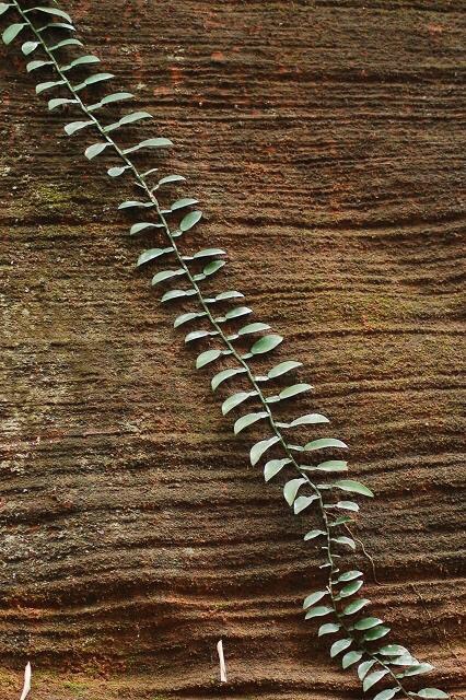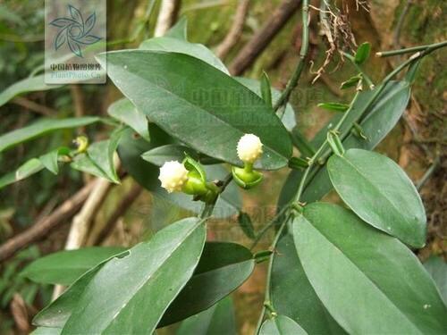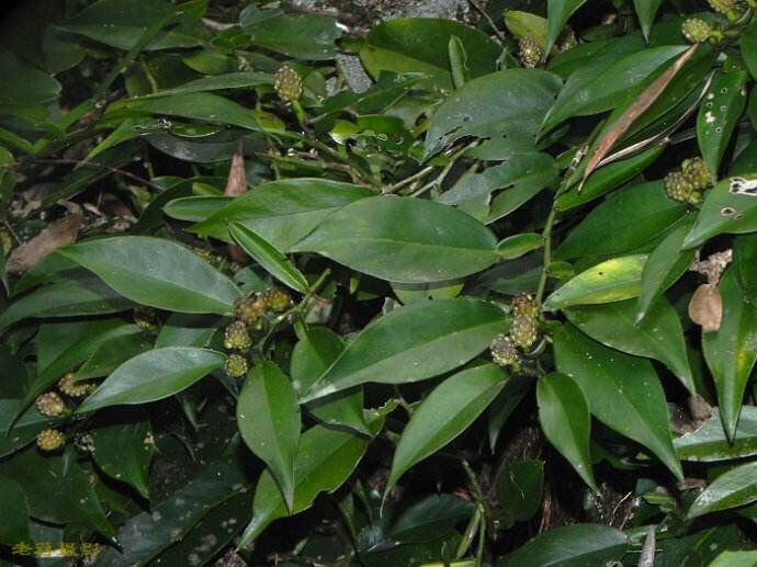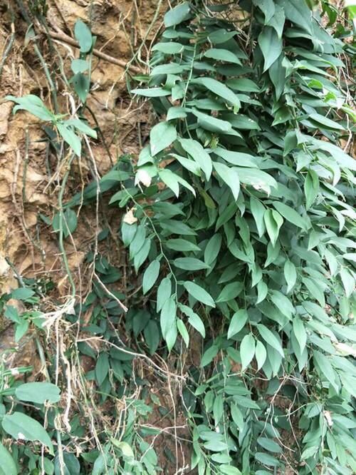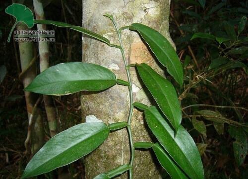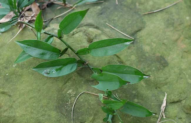 石柑子(Pothos chinensis (Raf.) Merr.):又名竹结草、爬山虎、巴岩香、百步藤。是单子叶植物纲、天南星科、石柑属附生藤本。茎亚木质,淡褐色,近圆柱形,具纵条纹,节上常束生长1-3厘米的气生根;分枝;叶片纸质,长6-13厘米,宽1.5 5-5.6厘米;中肋在表面稍下陷,背面隆起,侧脉4对;叶柄倒卵状长圆形或楔形,长1-4厘米,宽0.5-1.2厘米。花序腋生,基部具苞片4-5枚;苞片卵形,长5毫米;浆果黄绿色至红色,卵形或长圆形,长约1厘米。花果期四季。
