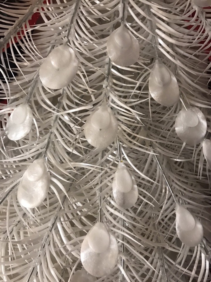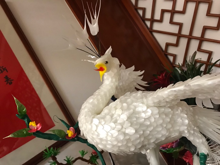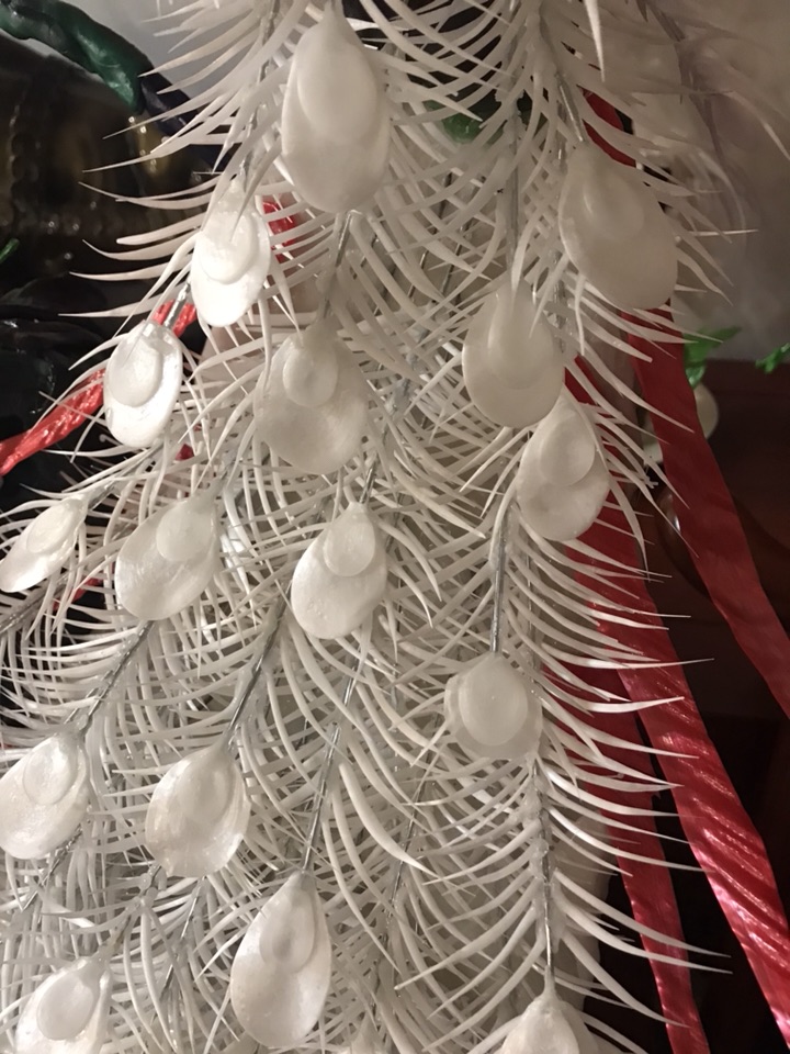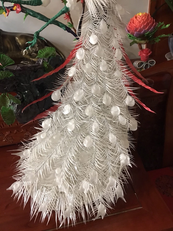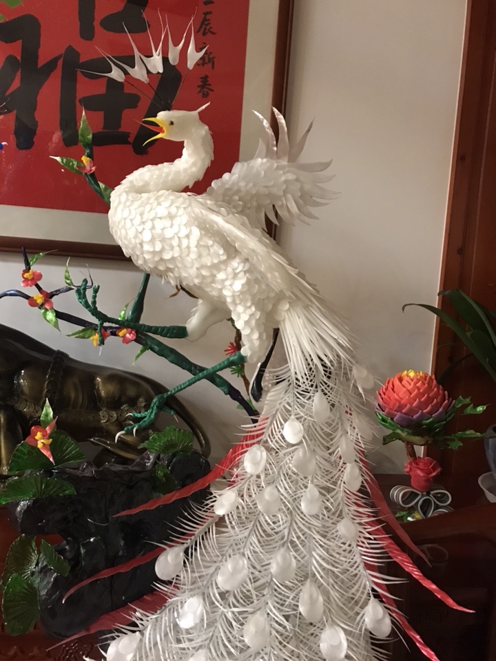 这是朋友的新作,一只拖着长尾的孔雀。尤其喜欢这及地的长尾巴,给人带来婚纱般的幸福感。听朋友说这都是一根根粘上去的,特别的费时也特别的考验耐心