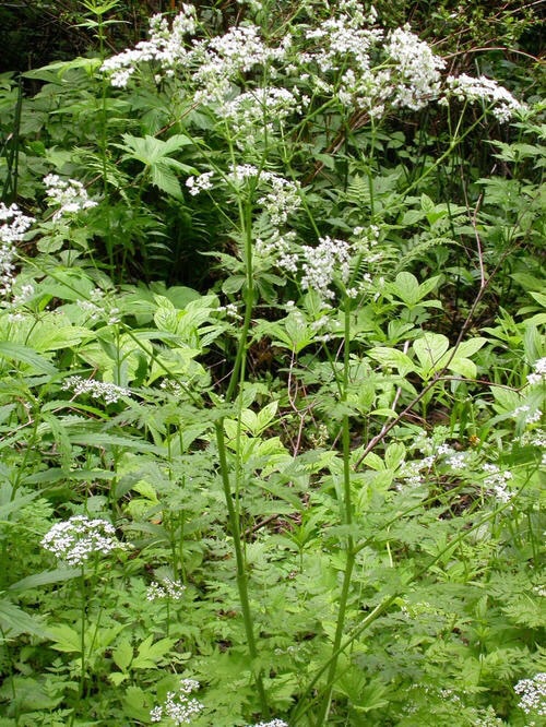 峨参(学名:Anthriscus sylvestris (L.) Hoffm. Gen.):是伞形科、峨参属的一种二年生或多年生草本植物。茎较粗壮,高可达1.5米,多分枝,基生叶有长柄,叶片轮廓呈卵形,羽状全裂或深裂,有粗锯齿,背面疏生柔毛;复伞形花序;小总苞片卵形至披针形,花白色,通常带绿或黄色;果实长卵形至线状长圆形,4-5月开花结果。