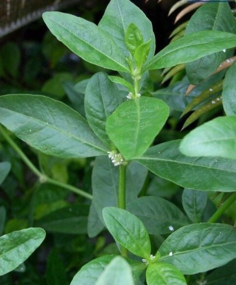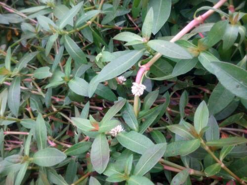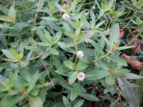 喜旱莲子草 (学名:Alternanthera philoxeroides (Mart.) Griseb.) 是苋科 ,莲子草属多年生草本植物;茎基部匍匐,管状,茎老时无毛,叶片矩圆形、矩圆状倒卵形或倒卵状披针形,顶端急尖或圆钝,具短尖,基部渐狭,两面无毛或上面有贴生毛及缘毛,叶柄无毛或微有柔毛。花密生,总花梗的头状花序,单生在叶腋,苞片及小苞片白色, 苞片卵形,花被片矩圆形,白色,光亮,无毛,子房倒卵形,5-10月开花。