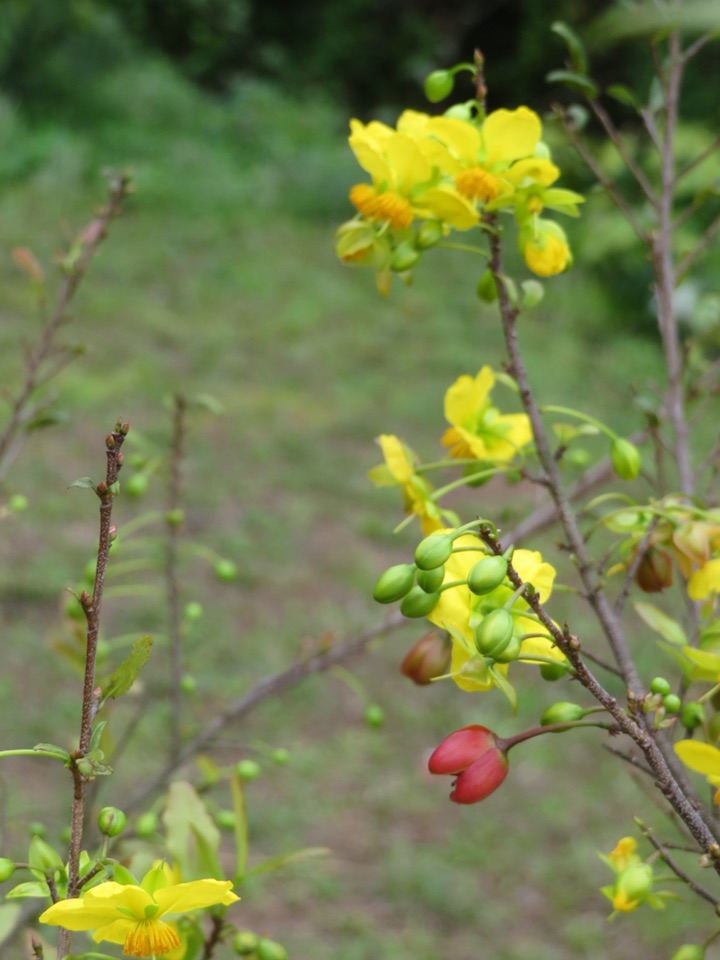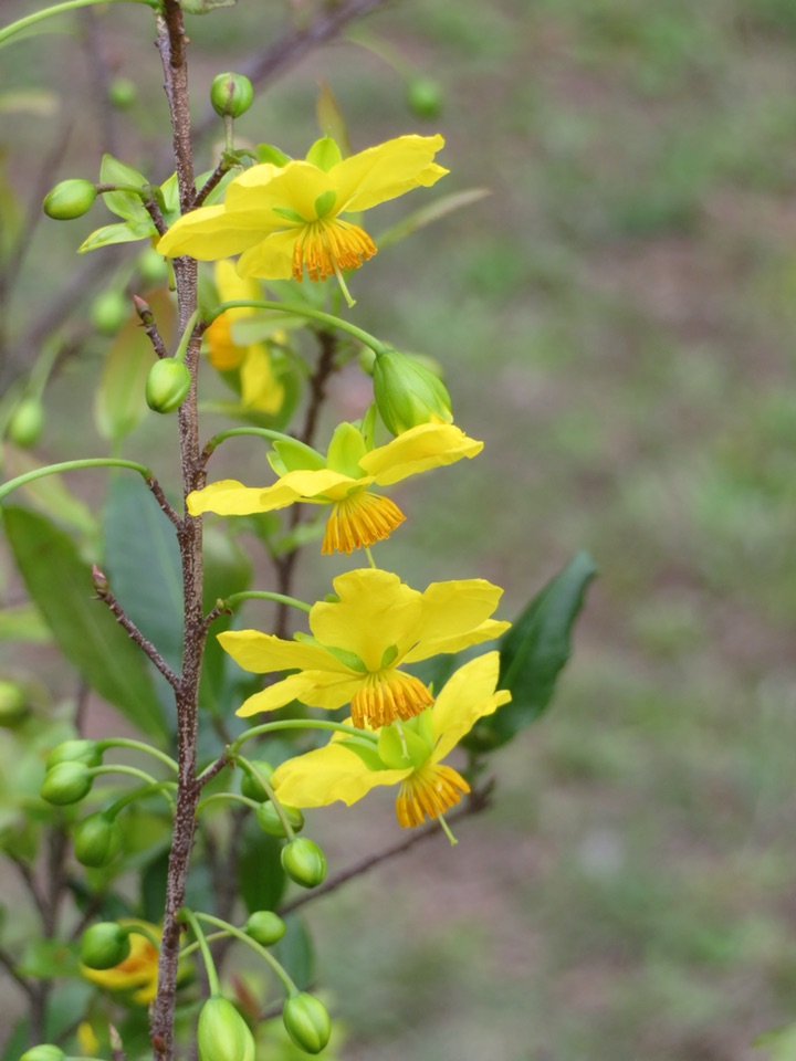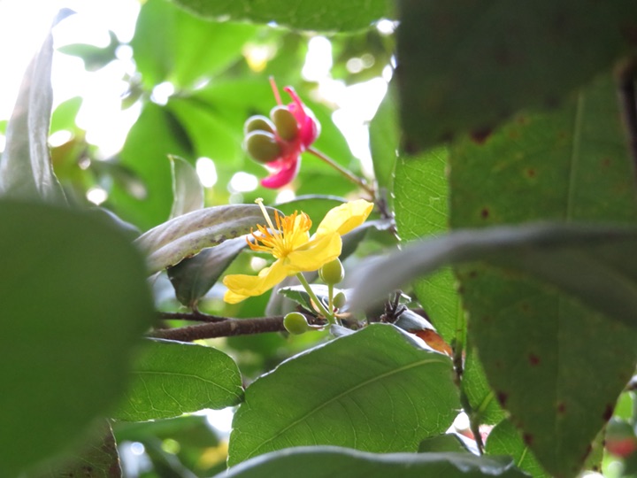 金莲木开花了!黄色是它的花瓣,花萼长圆形,开花时花萼外翻,结果时花萼呈暗红色,果实绿叶。
