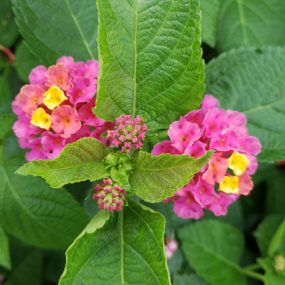 马樱丹的花朵是由大量的小花组成的花序,每个花序有20多朵花,花冠筒细长,顶端多五裂,状似梅花。开放时从外向中间次第开放(划重点:从外向里开放)。第一朵小花刚刚开的时候是黄色的,随着其它小花渐渐开放,小花的颜色也开始慢慢转变,粉色,橙色,桔色,深红色等等,由于颜色转变的次第性,一个花序上同时会呈现多种颜色,而一大片马樱丹的花朵则出现五颜六色,非常有特色。因为它的这个独特色彩特性,很多人叫它们五色梅,或者五彩花,或者变色草。这是它美丽的一面。