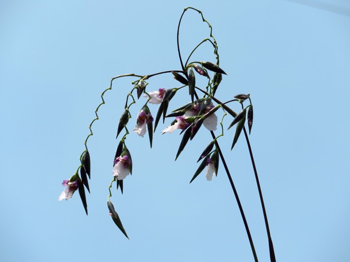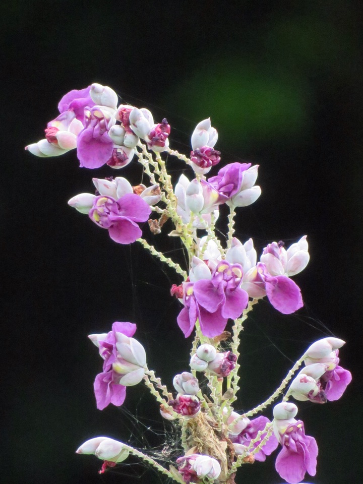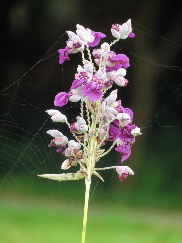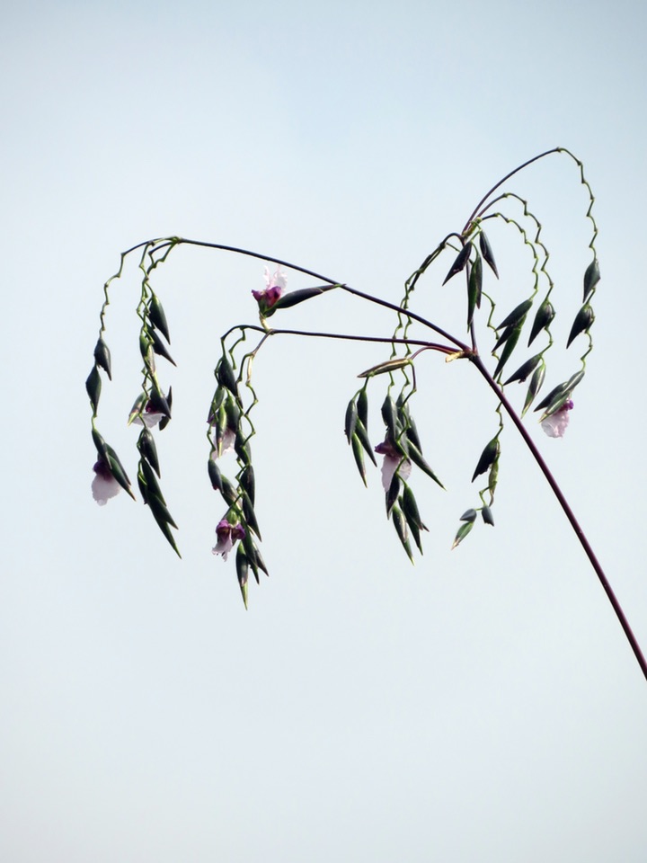再力花是多年生挺水草本植物。复总状花序,花小紫堇色。花柄细长,花茎可高达三米,茎端开紫花。形状很特殊。还有垂花再力花更是奇特。