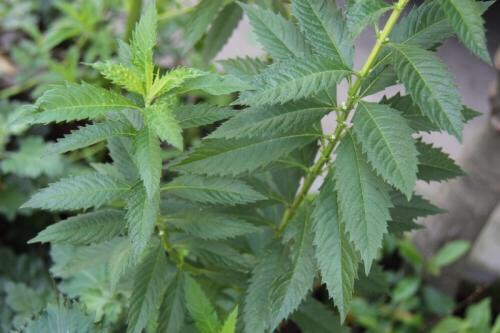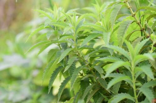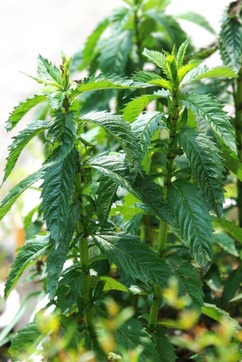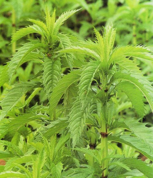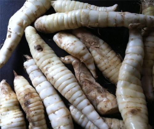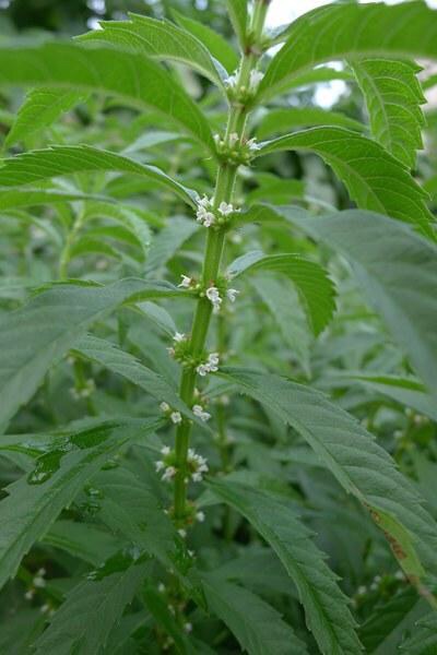 地笋(学名:Lycopus lucidus Turcz.):多年生草本,根茎横走,具节,节上密生须根。叶具极短柄或近无柄,长圆状披针形,两面或上面具光泽,亮绿色,两面均无毛。轮伞花序无梗,轮廓圆球形,小苞片卵圆形至披针形,位于外方者超过花萼。花萼钟形,两面无毛,外面具腺点。花冠白色,花丝丝状,无毛,花药卵圆形,2室,花柱伸出花冠。小坚果倒卵圆状四边形,褐色,边缘加厚,背面平,腹面具稜,有腺点。花期6-9月,果期8-11月。春、夏季可采摘嫩茎叶凉拌、炒食、做汤,根茎入药,具有降血脂、通九窍、利关节、养气血等功能。