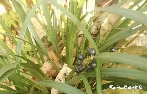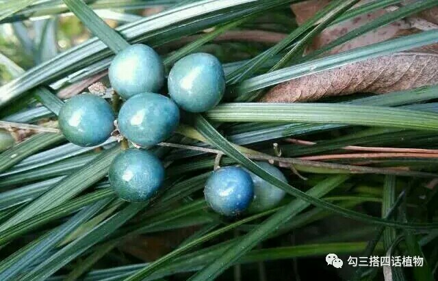 上图一是麦冬即将成熟的果实,蓝色,完全成熟之后,蓝的更加诱人,陈淏《花镜》中的阶前草即是麦冬,言其果“实碧圆如株”。图二是阔叶山麦冬的果实,黑色。两者果实在未成熟之前都是绿色,很难区分。