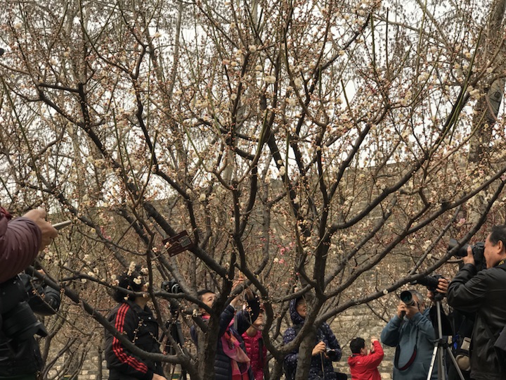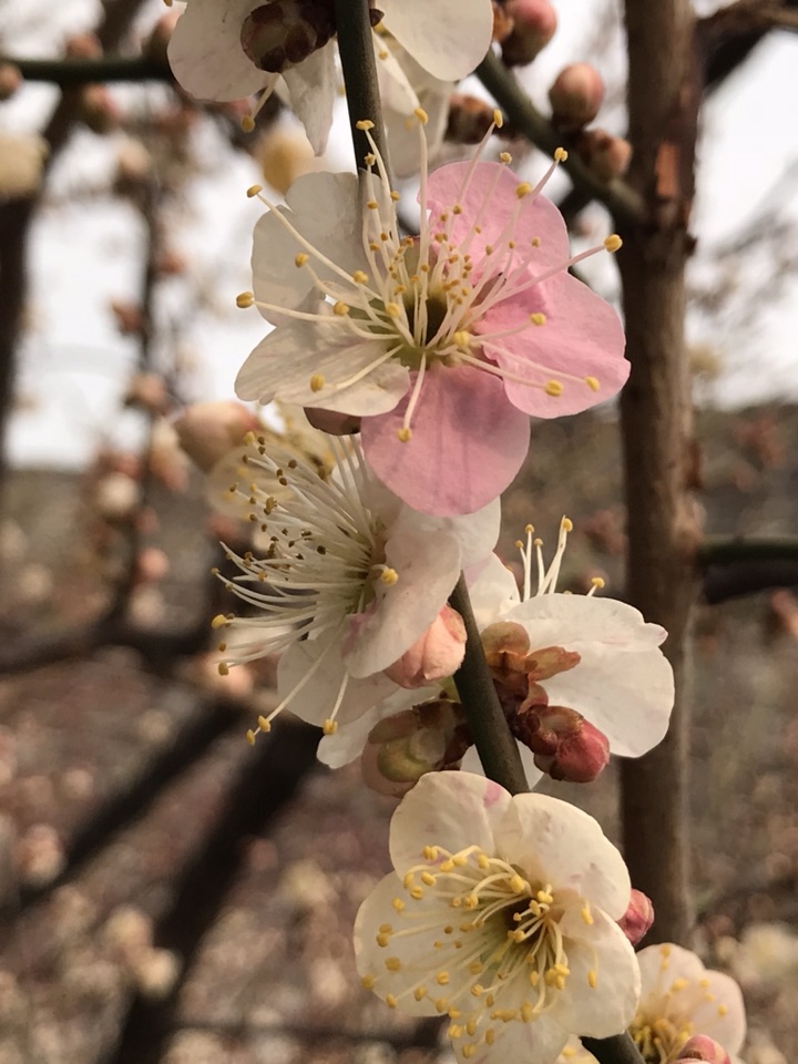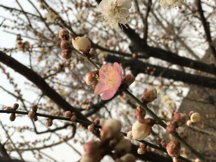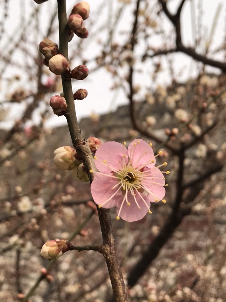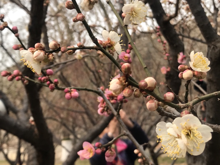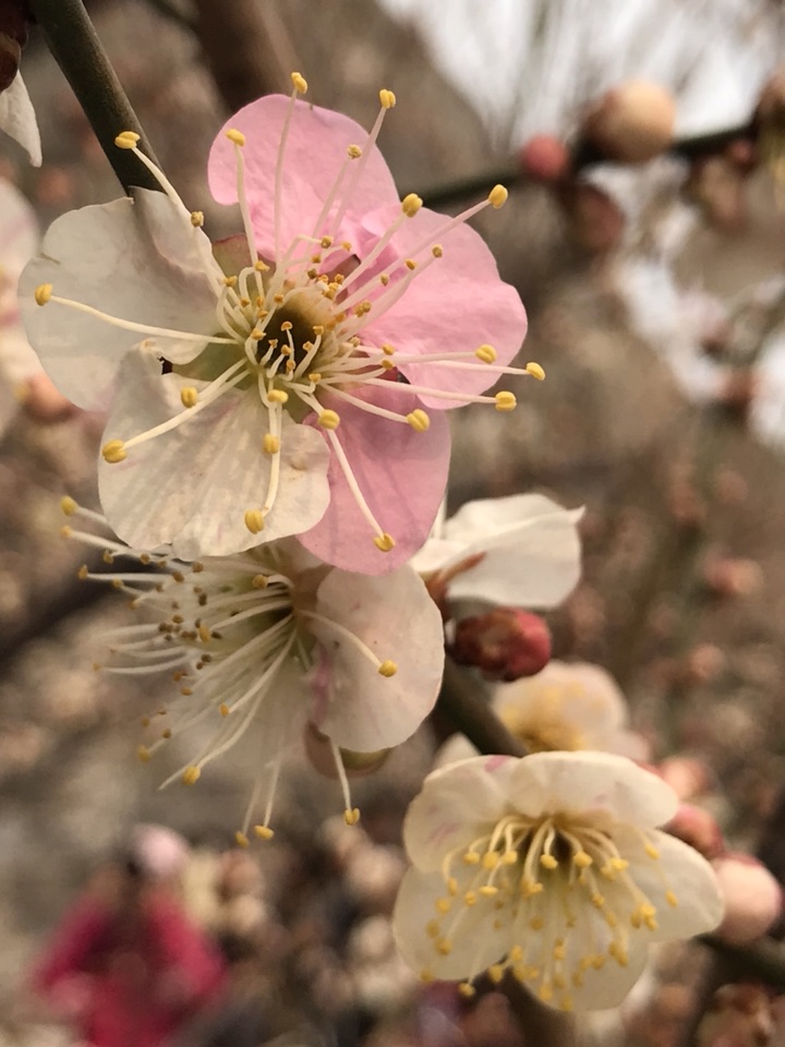 这几株梅花也吸引了不少的围观,同一枝开着不同颜色的花花,更有同一枚花白粉平分秋色