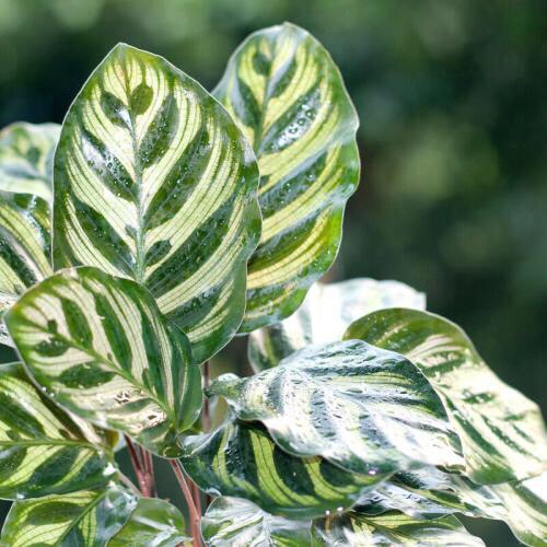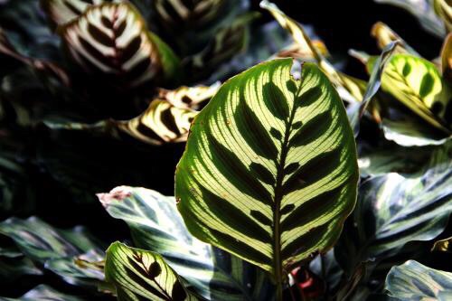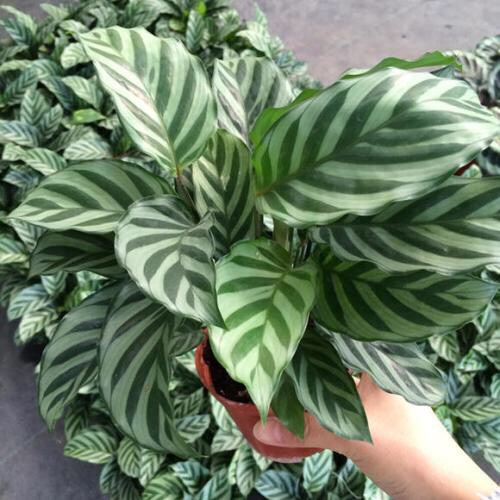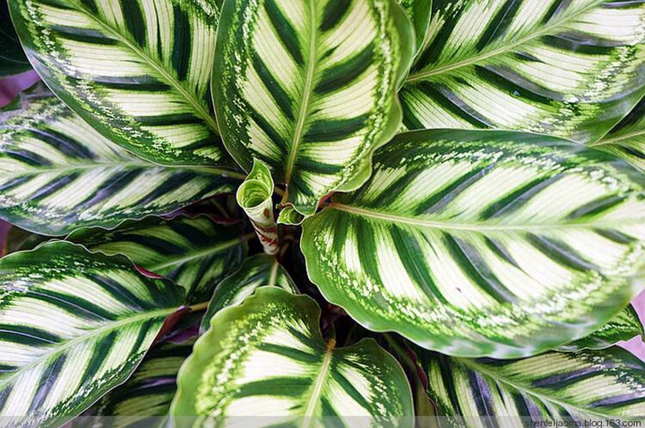 孔雀竹芋(学名:Calathea makoyana E. Morr.):竹芋科,肖竹芋属多年生常绿草本。植株挺拔株高可达60厘米。叶柄紫红色, 叶片薄革质,卵状椭圆形,叶面上有墨绿与白色或淡黄相间的羽状斑纹,就像孔雀尾羽毛上的图案,因而得名。叶片亦有特性:白天舒展,晚间折叠起来。