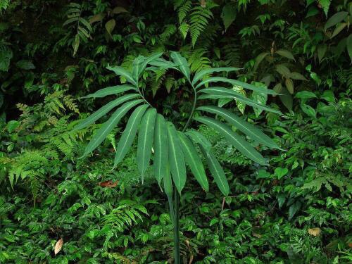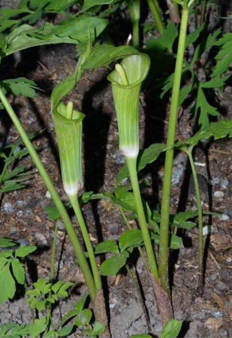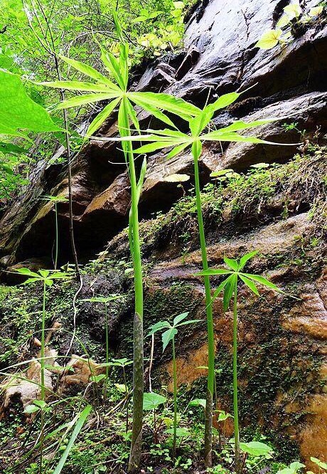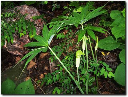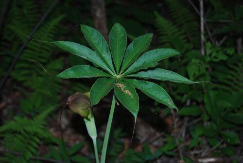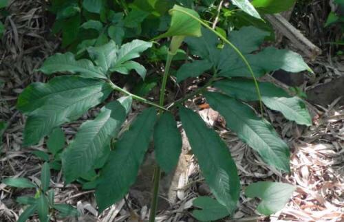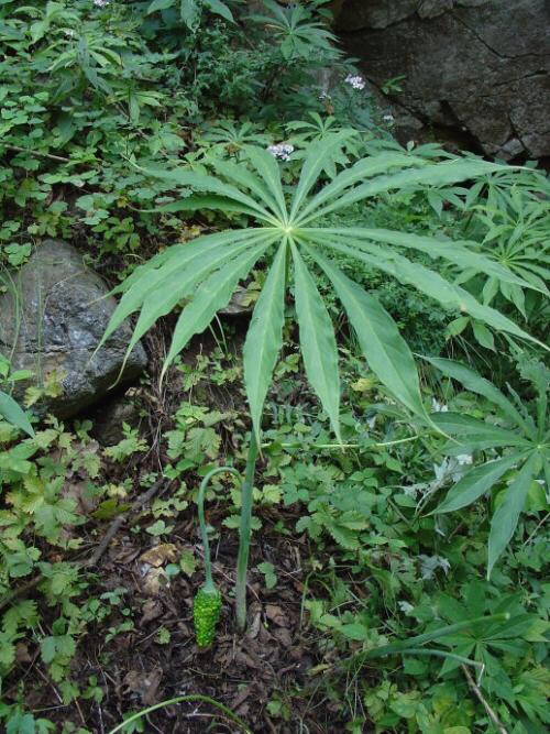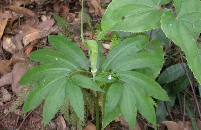 天南星,(学名:Arisaema heterophyllum Blume)天南星科草本植物,块茎扁球形,直径2-4厘米,顶部扁平,周围生根,常有若干侧生芽眼。鳞芽4-5,膜质。叶常单1,叶柄圆柱形,粉绿色,下部3/4鞘筒状;叶片鸟足状分裂,裂片13-19,有时更少或更多,倒披针形。花序柄长30-55厘米,从叶柄鞘筒内抽出。佛焰苞管部圆柱形;檐部卵形或卵状披针形。肉穗花序两性和雄花序单性。两性花序。单性雄花序长3-5厘米,粗3-5毫米。雌花球形,花柱明显,柱头小。雄花具柄,花药2-4,白色,顶孔横裂。浆果黄红色、红色,圆柱形,种子黄色,具红色斑点。花期4-5月,果期7-9月。