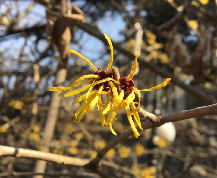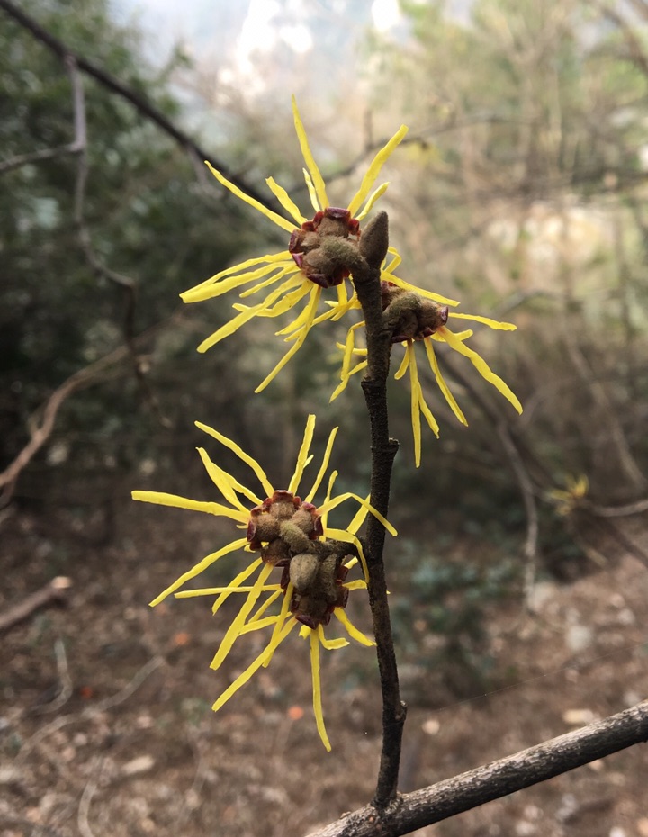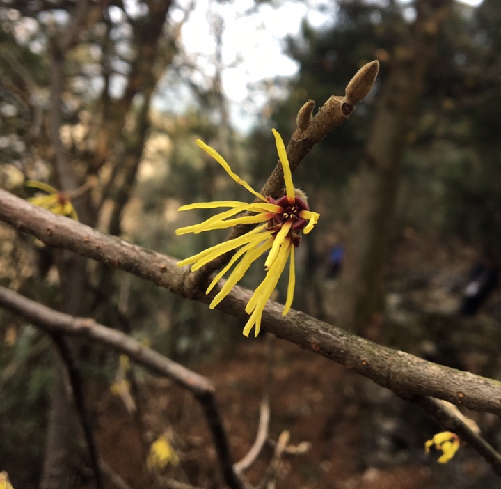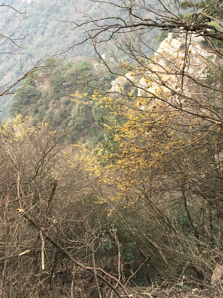 在庐山锦绣谷景区发现了一种开黄花的树,无叶,山前山后到处都有,看着很有祥瑞之气,看着它细条型的花瓣,我还以为它跟红花檵木相近呢,谁知查了以后得知,它竟然叫金缕梅,缕倒是很形象,只是没想到它是梅的一种。