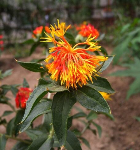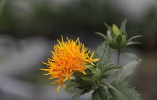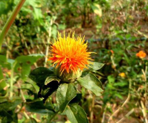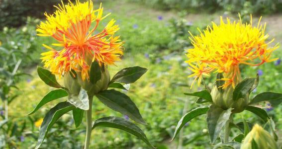 红花,(拉丁学名:Carthamus tinctorius L.),别名:红蓝花 、刺红花,菊科、红花属植物,干燥的管状花,橙红色,花管狭细,先端5裂,裂片狭线形,花药黄色,联合成管,高出裂片之外,其中央有柱头露出。具特异香气,味微苦。以花片长、色鲜红、质柔软者为佳。