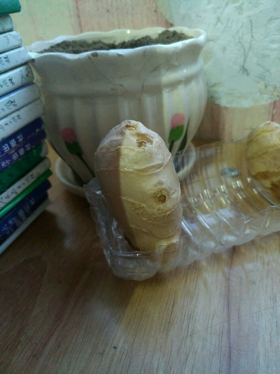 自己家拿的姜块,本来已经埋土里,不过有人建议出芽再种。然后我就用瓶子做了个容器,泡上了,期待发芽。