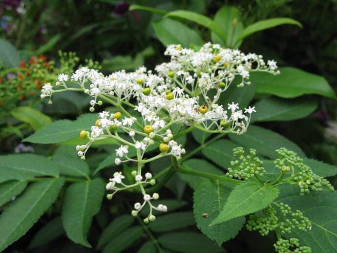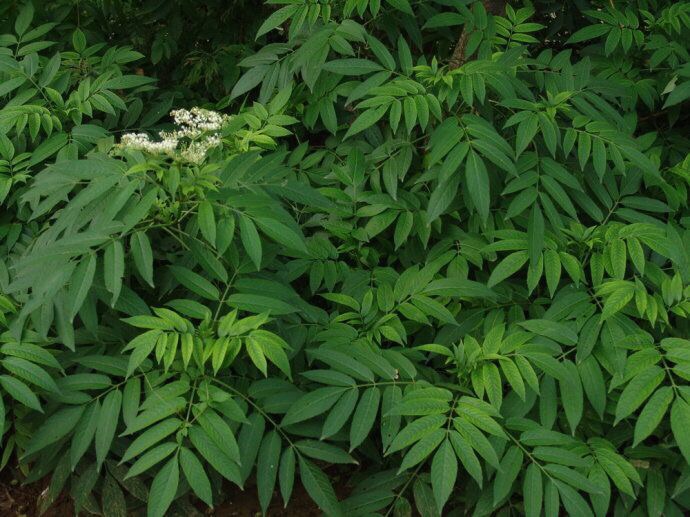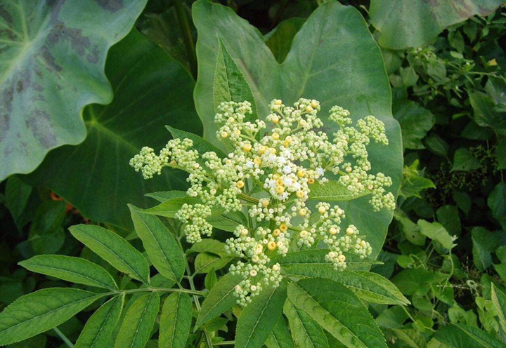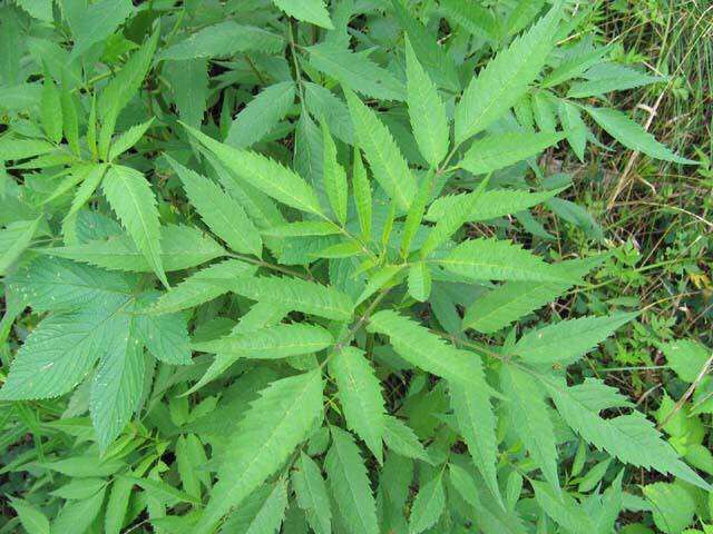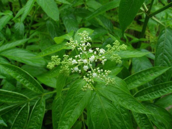 接骨草(学名:Sambucus chinensis Lindl.)是忍冬科,接骨木属高大草本或半灌木,高可达2米;茎有棱条,羽状复叶的托叶叶状或有时退化成蓝色的腺体;小叶片互生或对生,狭卵形,先端长渐尖,基部钝圆,两侧不等,边缘具细锯齿,无托叶,复伞形花序顶生,大而疏散,总花梗基部托以叶状总苞片,纤细,可孕性花小;萼筒杯状,萼齿三角形;花冠白色,花药黄色或紫色;果实红色,近圆形,表面有小疣状突起。4-5月开花,8-9月结果