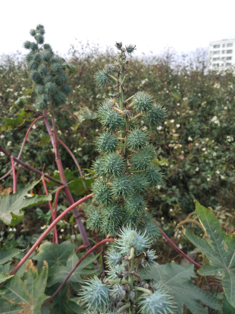 记得有一次,我们看到了一株浑身是刺绿色的小球球,便摘下来踩碎来看看,里面都是一些果肉。后来才知道,原来那是蓖麻!