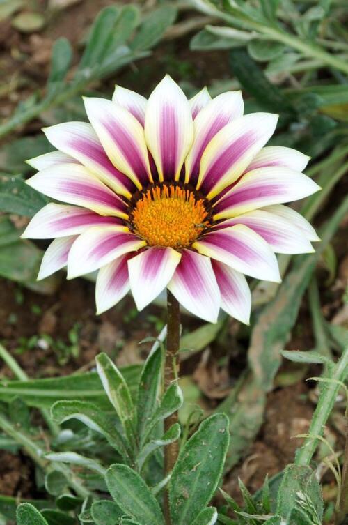 勋章菊(学名:Gazania rigens Moench)是菊科,勋章菊属多年生草本植物,具根茎。叶丛生,披针形或倒卵状披针形,全缘或有浅羽裂,叶背密被白绵毛。舌状花白、黄、橙红色有光泽。