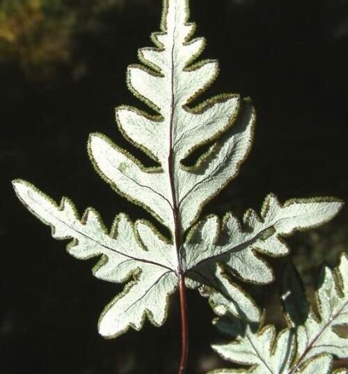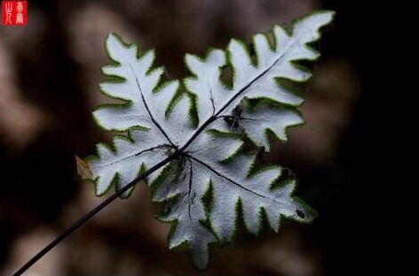 银粉背蕨株型小巧,叶形奇特,质硬有光泽,叶背银白清晰,其适应性很强,是难得的一种小型蕨类。它属蕨科粉背蕨属植物,根状茎直立或斜升,外被红棕色边的亮黑色披针鳞片,叶簇生,表面暗绿,背面有银白色或乳黄色粉粒,叶呈五角星状,羽片基部彼此相连或分离,顶生羽近于菱形,侧生羽片又为三角形,叶柄栗褐色,有光泽。