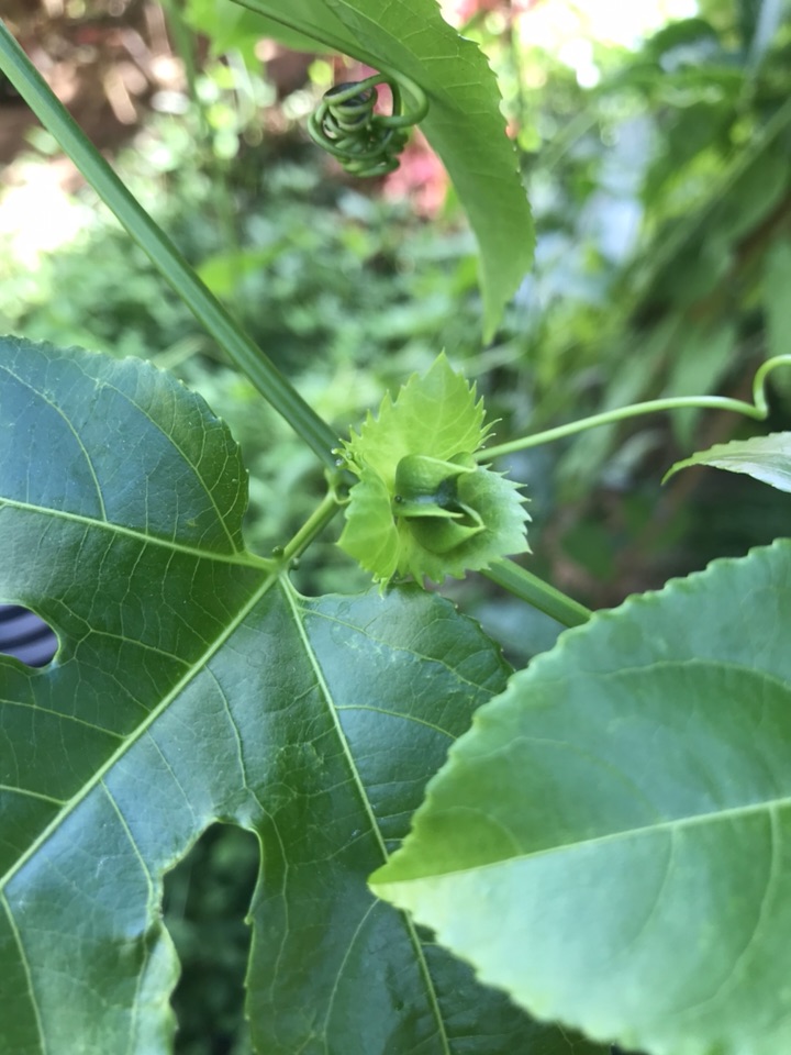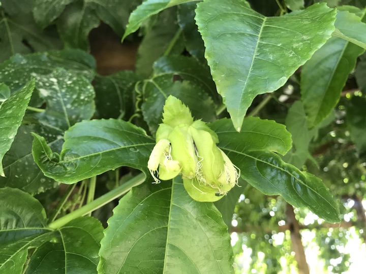 楚东农业里边,架子上爬的有三种植物,一是锦屏藤,二是炮仗花,三就是今天的主角鸡蛋果了。鸡蛋果的叶子大,铺天盖地的把整个长廊架子都盖满了,可谓壮观。繁密的叶片绿油油的,想要找个果子都是件费力的事情,搜寻了老半天终于找到这么一个果子。
