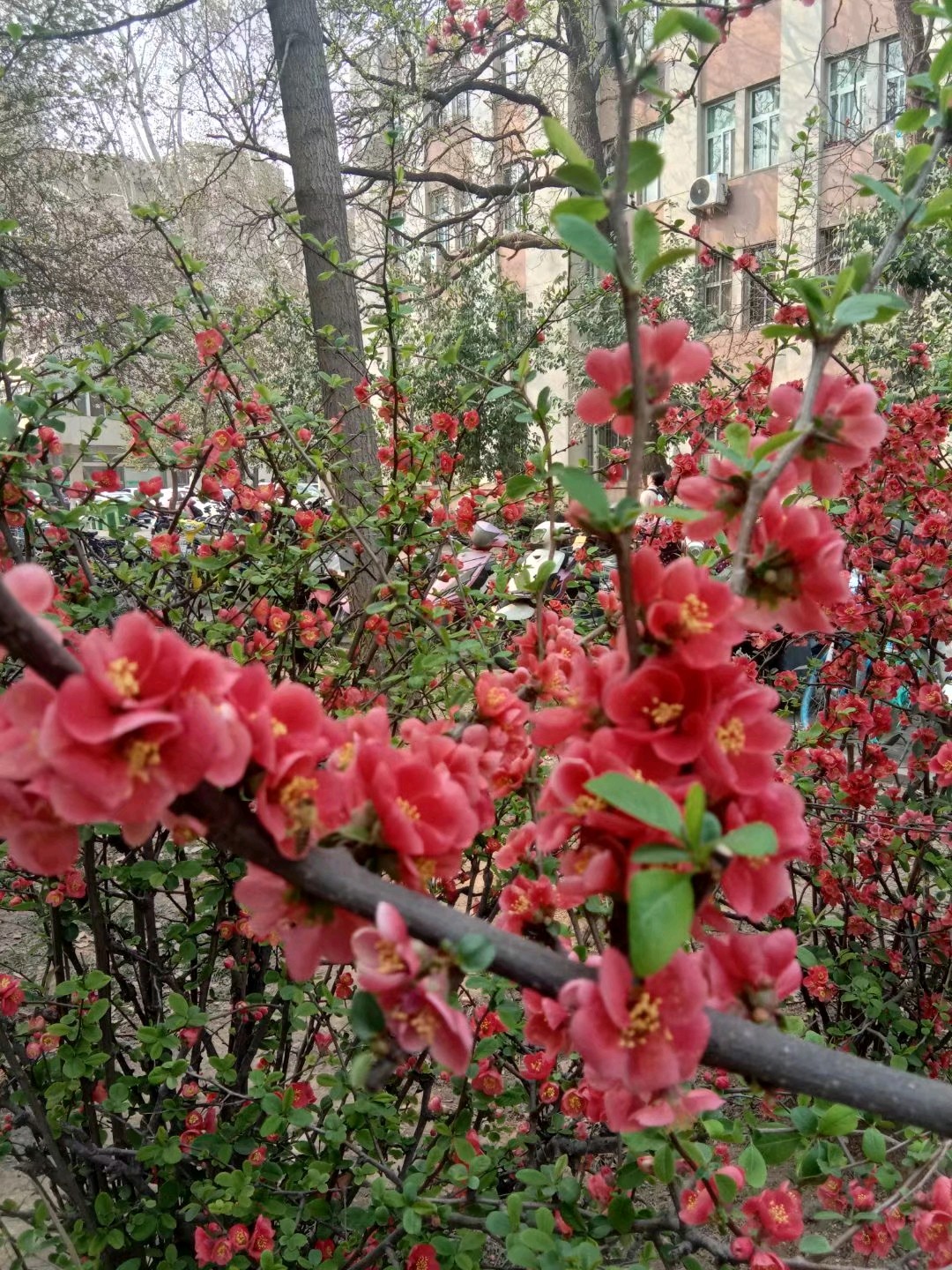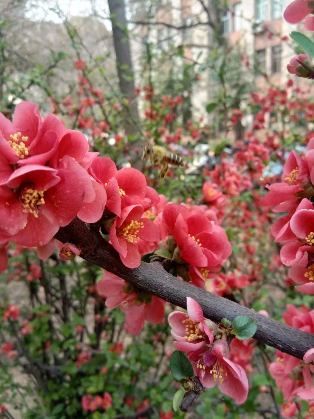 @江小伟&@&&海棠花开 洁白鲜红披雅妆 蜂飞蝶舞吻香忙 夜来一阵梨花雨 诗友白日写海棠