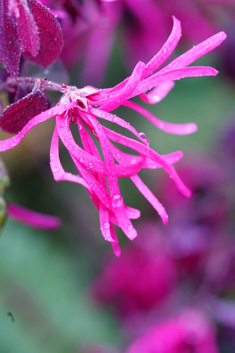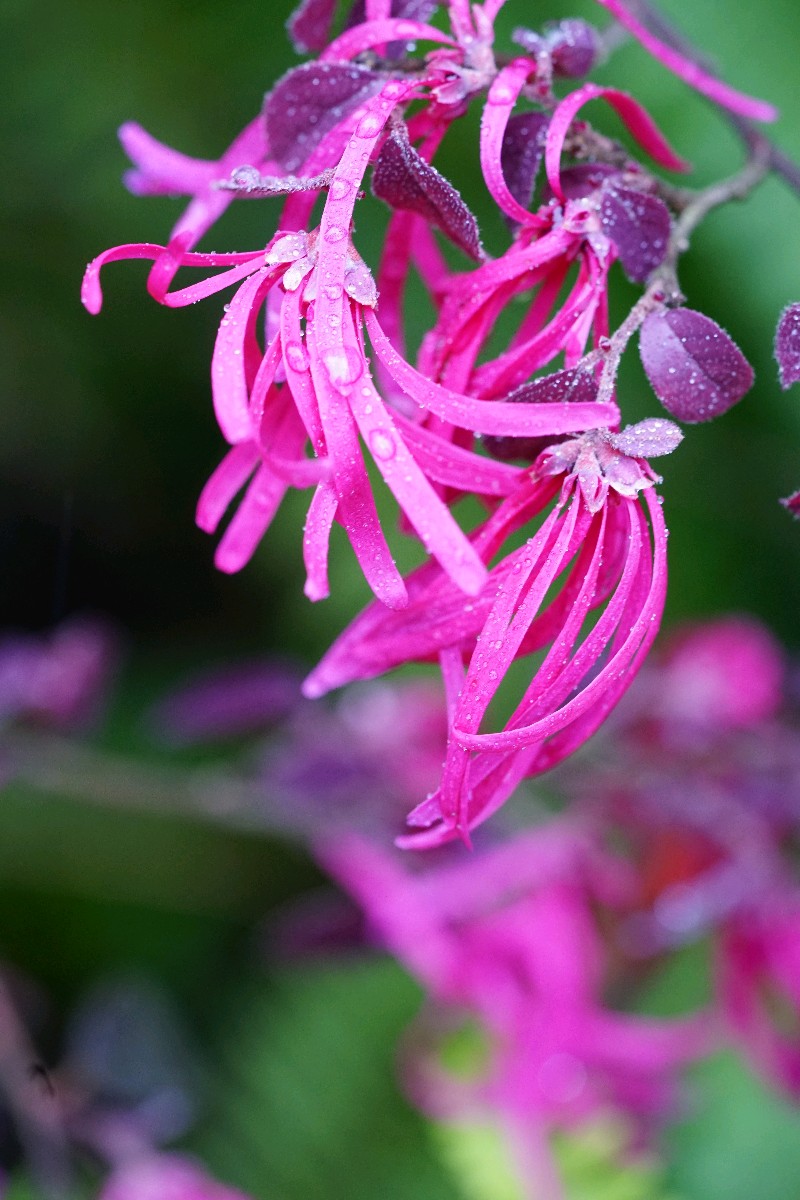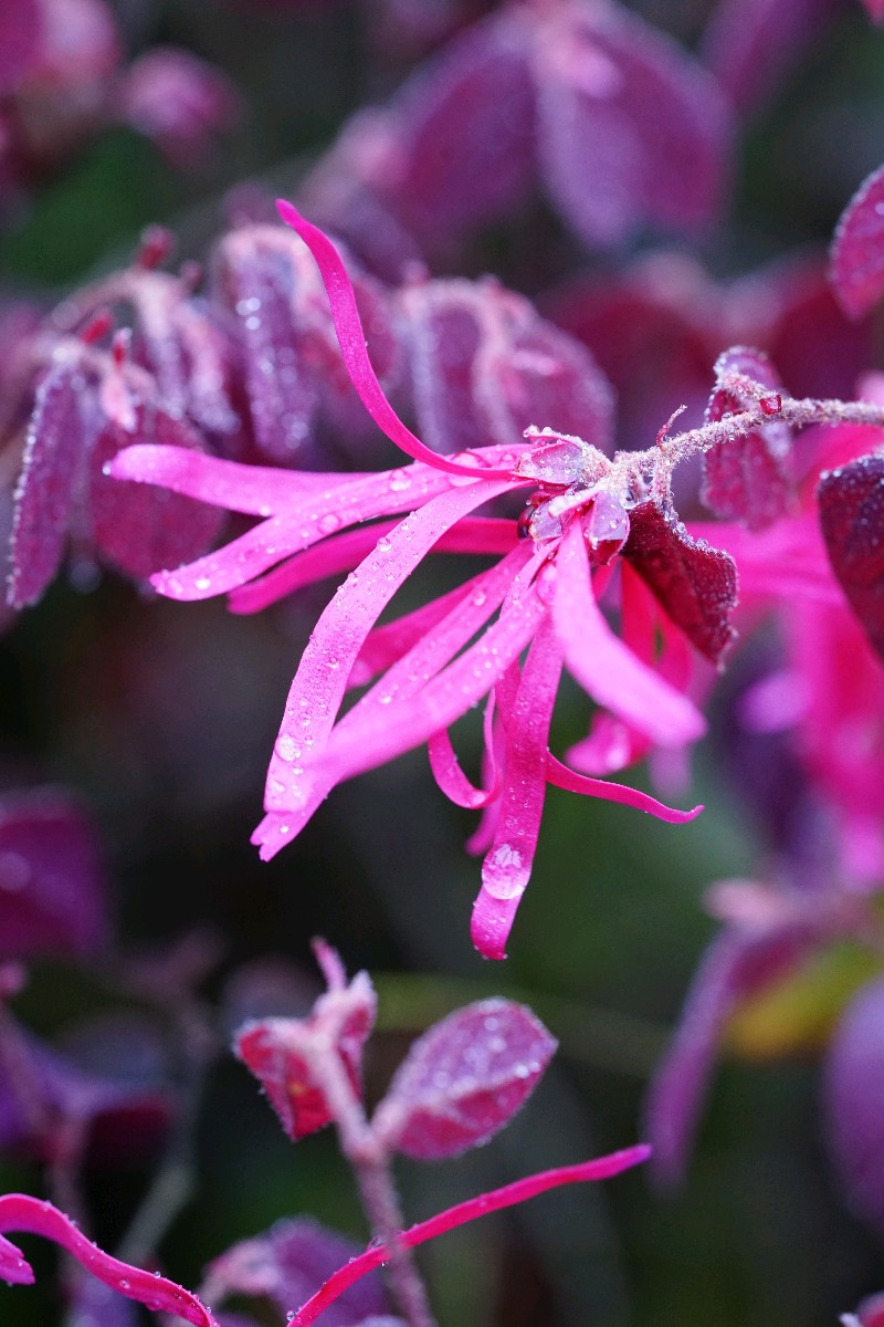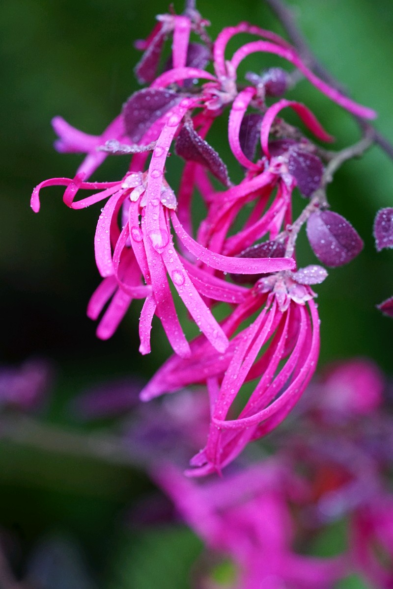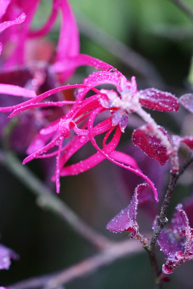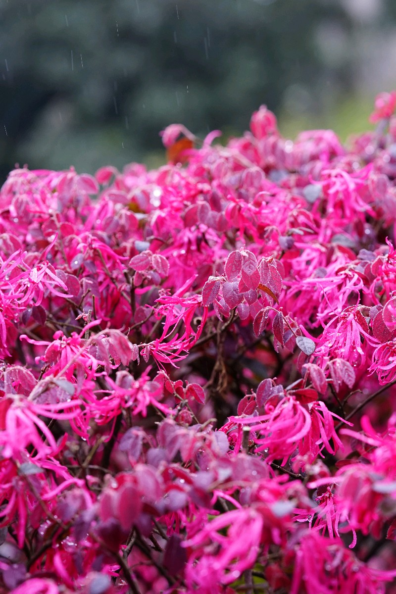 常绿灌木或小乔木,金缕梅科。“檵”,似乎是祖先专为此花所造之字。紫红色线形的花,如丝如带。红花檵木的花语:热烈、豪放、红颜如火。今天在春雨中拍摄,其花、叶色彩竟如此绚烂,惊艳了时光,温暖了岁月。