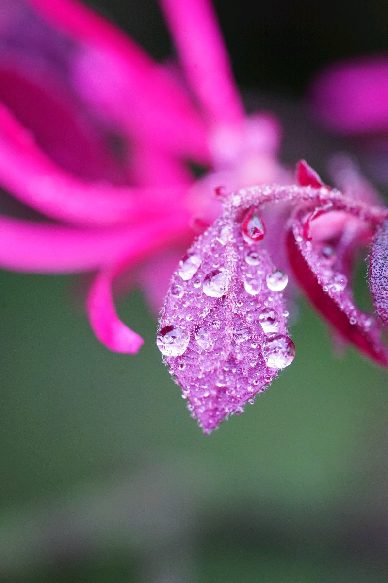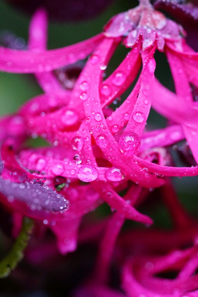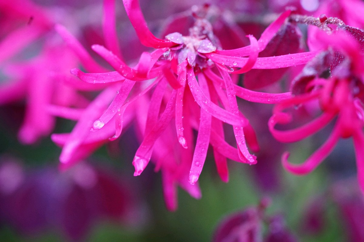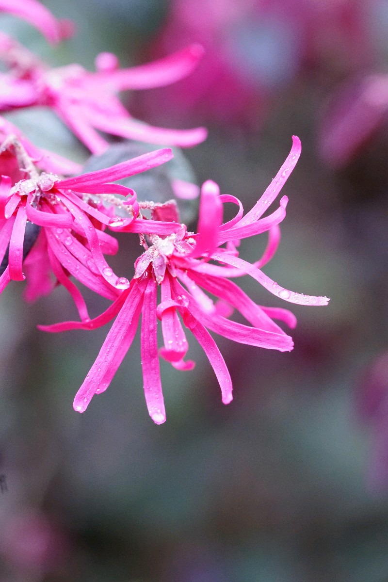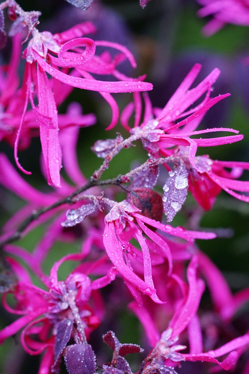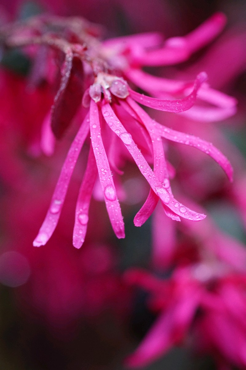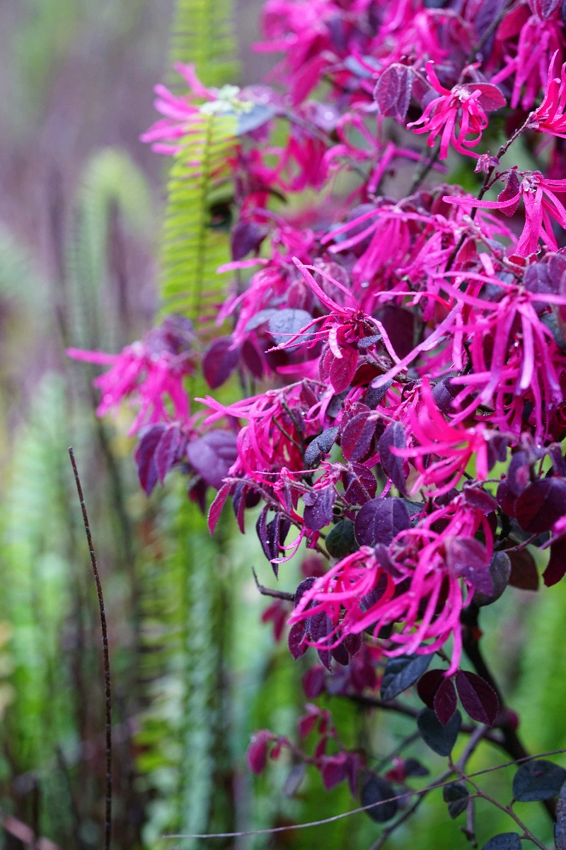 常绿灌木或小乔木,金缕梅科。“檵”,似乎是祖先专为此花所造之字。紫红色线形的花,如丝如带。红花檵木的花语:热烈、豪放、红颜如火。今天在春雨中拍摄,其花、叶色彩竟如此绚烂,惊艳了时光,温暖了岁月。