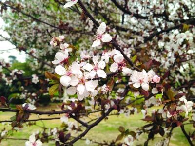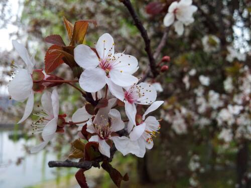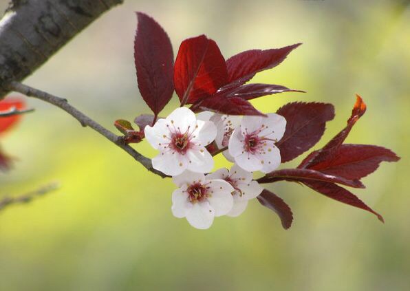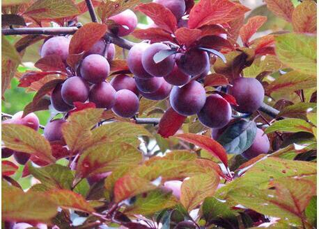 紫叶李,别名:红叶李,蔷薇科李属落叶小乔木,高可达8米,原产亚洲西南部,中国华北及其以南地区广为种植。叶常年紫红色,著名观叶树种,孤植群植皆宜,能衬托背景。尤其是紫色发亮的叶子,在绿叶丛中,像一株株永不败的花朵,在青山绿水中形成一道靓丽的风景线。