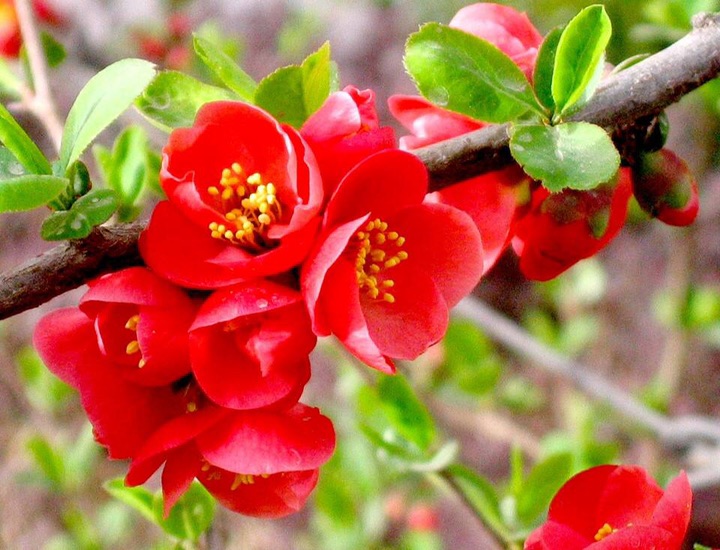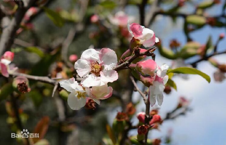 花先叶开放,花梗短粗或进无梗,又名毛叶木瓜。