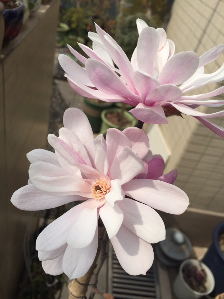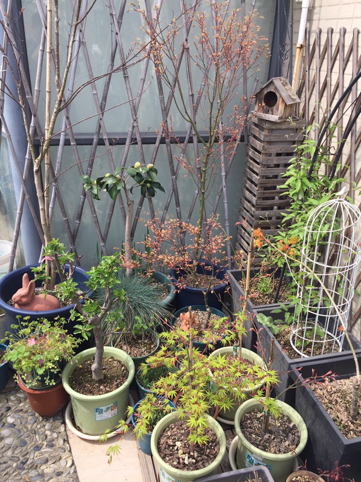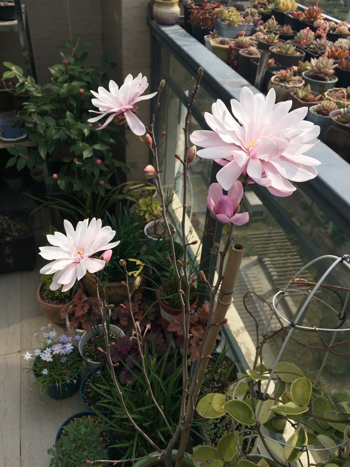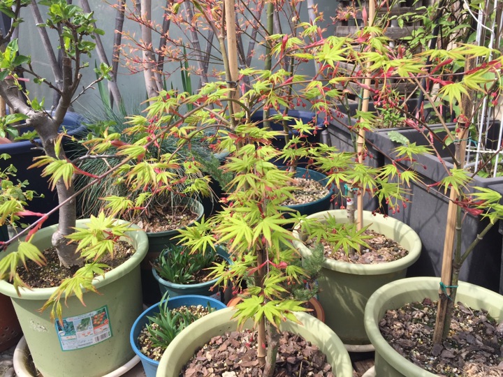 春日,所有植物都生机勃勃的,星花木兰开了,枫树新抽的叶子,带着花。