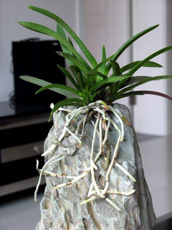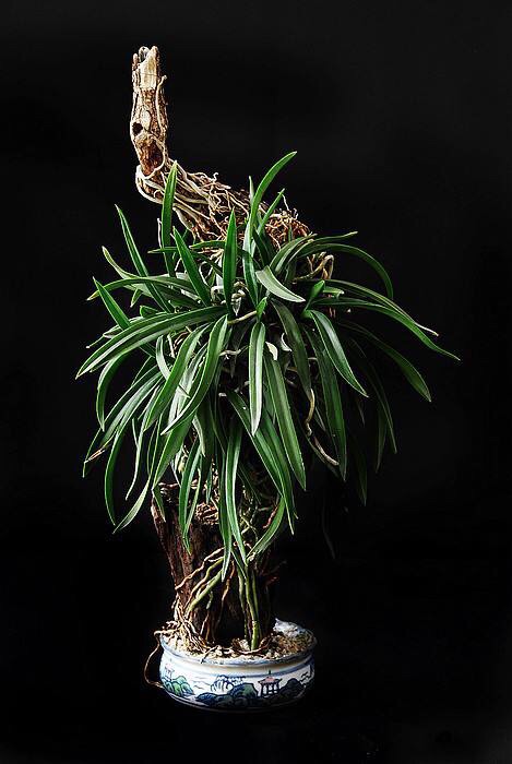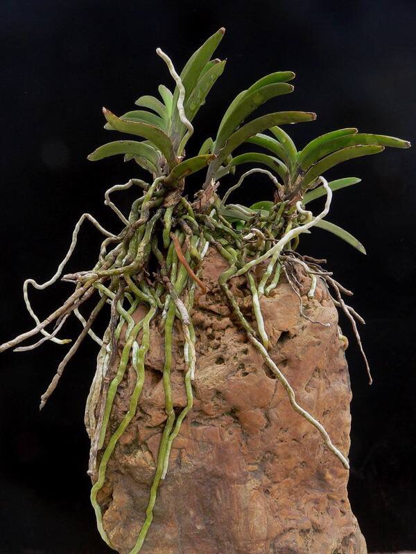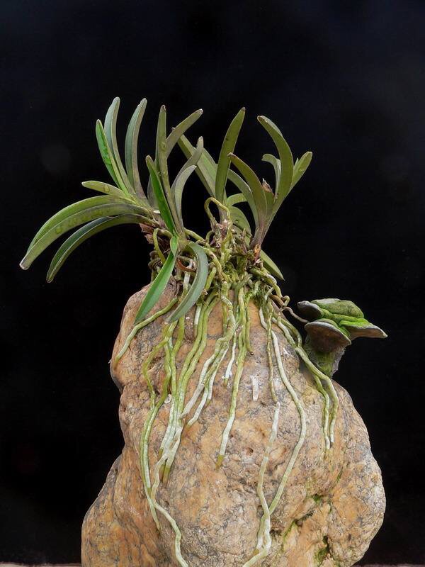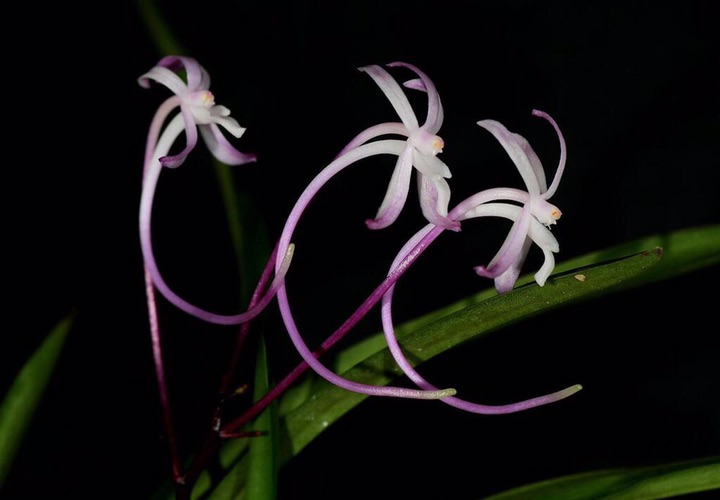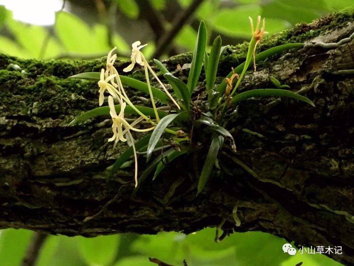 风兰(学名:Neofinetia falcata (Thunb. ex A. Murray) H. H. Hu):植株高8-10厘米。茎长1-4厘米,稍扁,被叶鞘所包。叶厚革质,狭长圆状镰刀形。