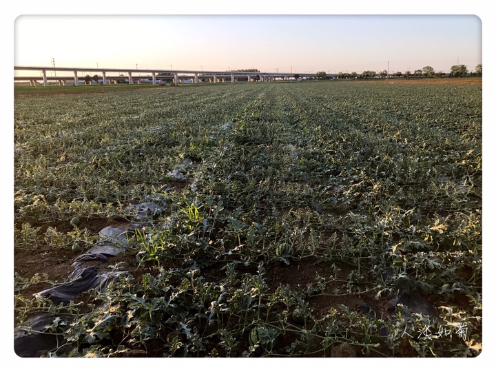 西瓜,是喜爱的水果之一。去瓜地看西瓜却不是经常,这次在水飞蓟地的对过便见到了大片的西瓜。