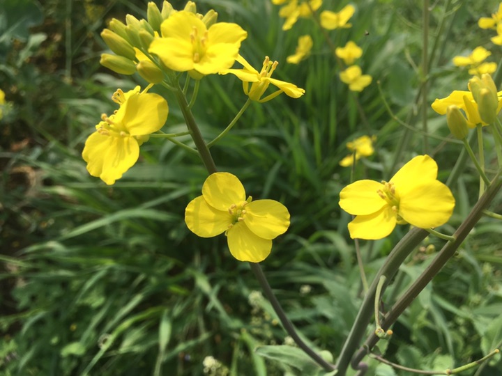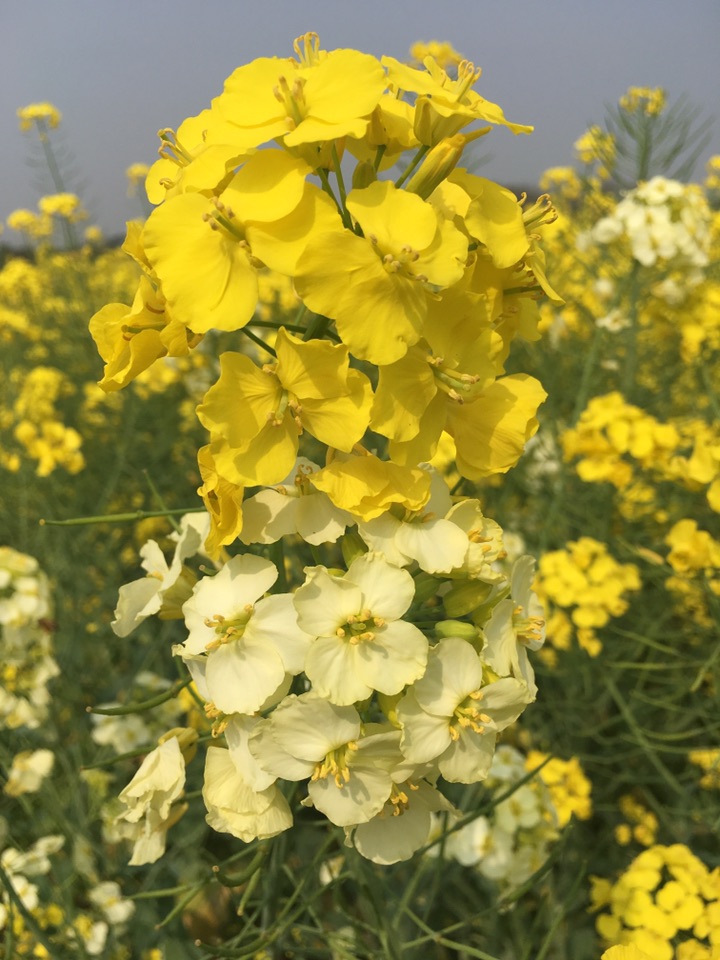 我告诉他一个学名:芸薹,为十字花科芸薹属一年生草本。他有点懵。我说这就是油菜花啊,是我们餐桌上非常熟悉的白菜的变种。他恍然大悟。