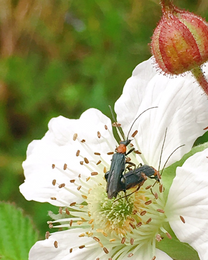 突然,菜地边低矮的蓬虆花吸引我的目光,拿手机轻轻按一张白花成片。突然好像听见了甲壳虫发出的咿咿呀呀的叫声,于是我拨了放大功能,居然拍下了这一张。
