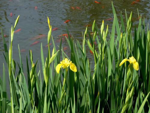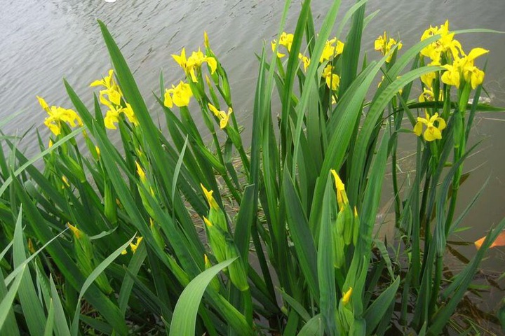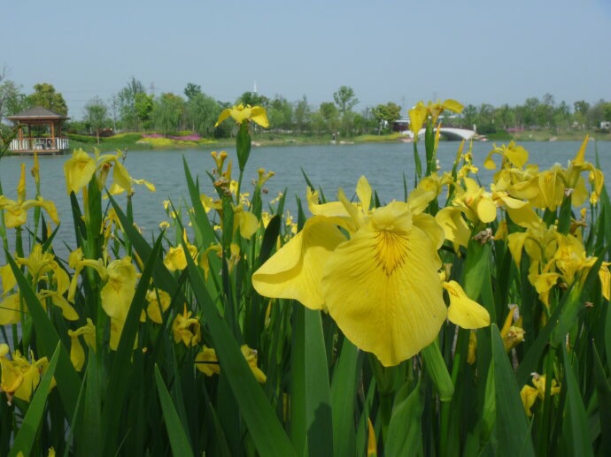 黄菖蒲(学名:Iris pseudacorus L.):是多年生湿生或挺水宿根草本植物,植株高大,根茎短粗。叶子茂密,基生,绿色,长剑形,长60-100厘米,中肋明显,并具横向网状脉 。花茎稍高出于叶,垂瓣上部长椭圆形,基部近等宽,具褐色斑纹或无,旗瓣淡黄色,花径8厘米。蒴果长形,内有种子多数,种子褐色,有棱角。