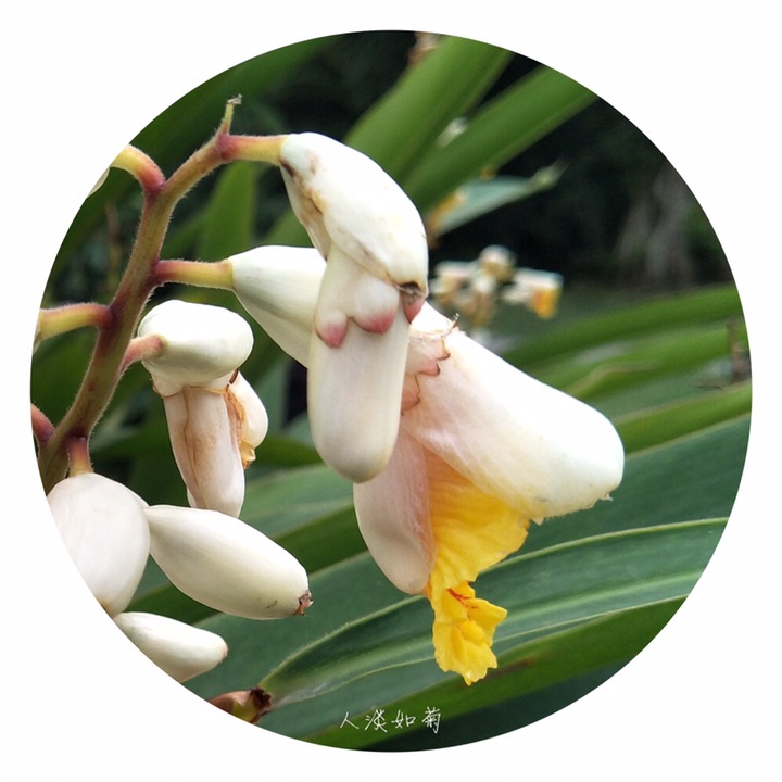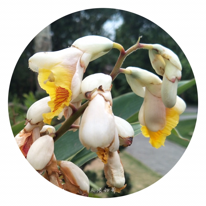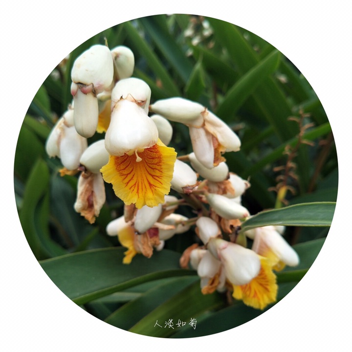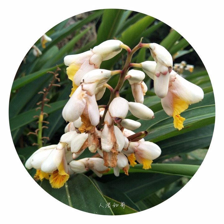 艳山姜(学名:Alpinia zerumbet (Pers.) Burtt. et Smith),别称彩叶姜、斑纹月桃。姜科山姜属植物,株高可达3米,叶片披针形,基部渐狭,边缘具短柔毛,两面均无毛;圆锥花序呈总状式,下垂,花序轴紫红色,分枝极短,小苞片椭圆形,白色,顶端粉红色,蕾时包裹住花,裂片长圆形,乳白色,顶端粉红色,唇瓣匙状宽卵形,子房被金黄色粗毛;种子有棱角。4-6月开花;7-10月结果。
