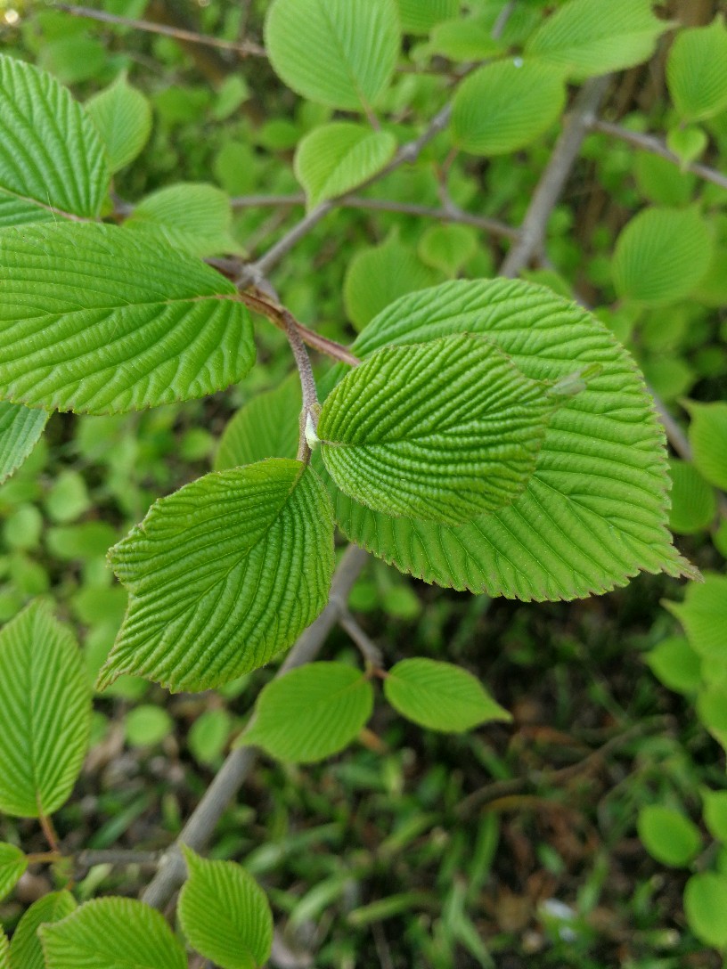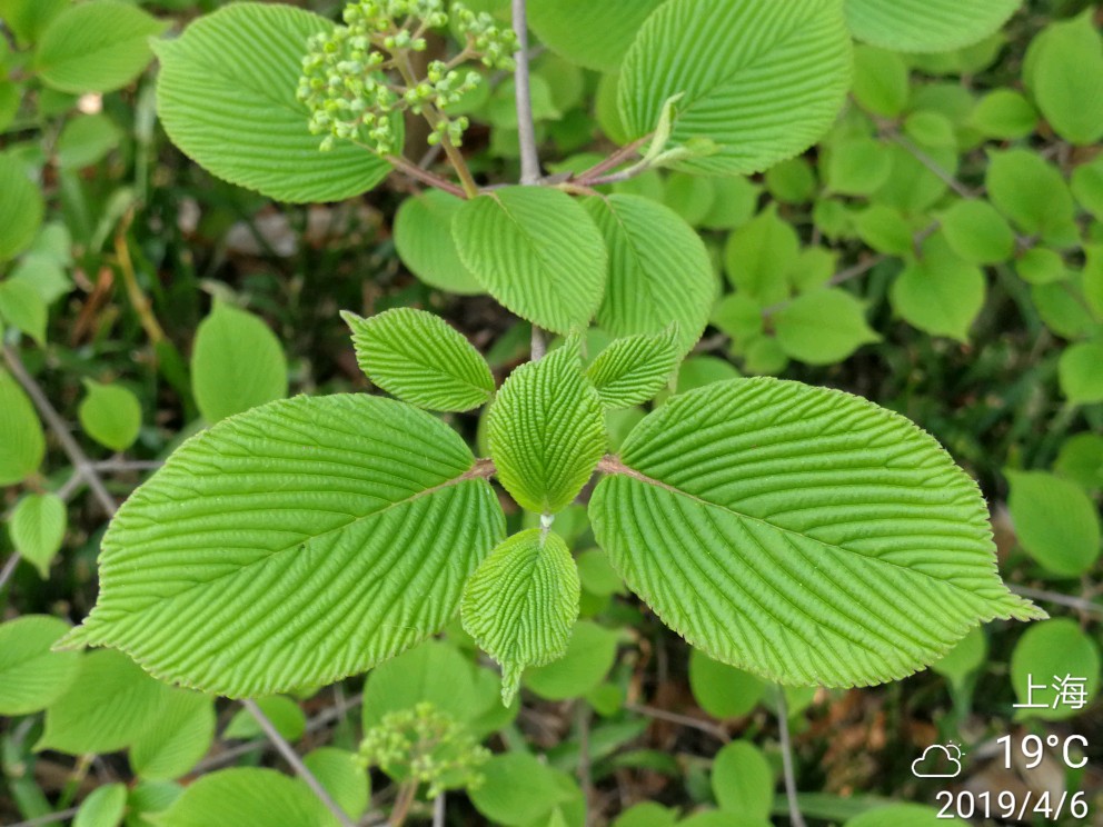 叶纸质,宽卵形、圆状倒卵形或倒卵形,稀近圆形,长4-10厘米,顶端圆或急狭而微凸尖,基部圆形或宽楔形,很少微心形,边缘有不整齐三角状锯齿,上面疏被短伏毛,中脉毛较密,下面密被绒毛,或有时仅侧脉有毛,侧脉10-12 (-13) 对,笔直伸至齿端,上面常深凹陷,下面显著凸起,小脉横列,并行,紧密,成明显的长方形格纹;叶柄长1-2厘米,被薄绒毛;无托叶。