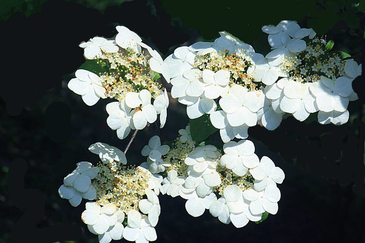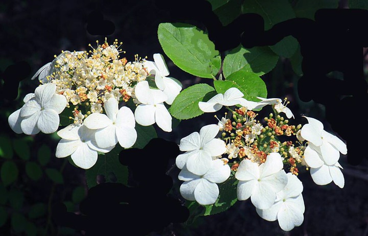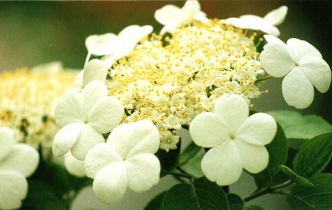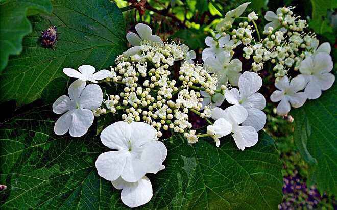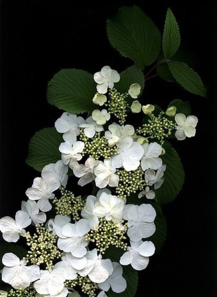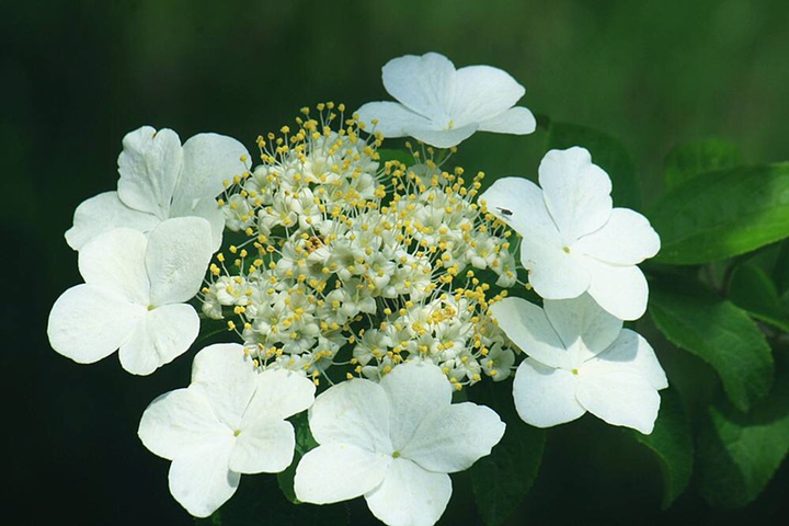 琼花Viburnum macrocephalum Fort. f. keteleeri (Carr.) Rehd.,又称聚八仙、蝴蝶花,与昙花相似,像牛耳抱珠。忍冬科落叶的半常绿灌木。4、5月间开花,花大如盘,洁白如玉。