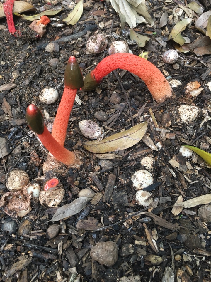 地上冒出来一根根红红的小枝条,以为是人家随意扔在路边的杂物。留意看看,原来是一种菌菇—疏花蛇菰。 地上一粒粒白色的小圆球就是它的头根部分。