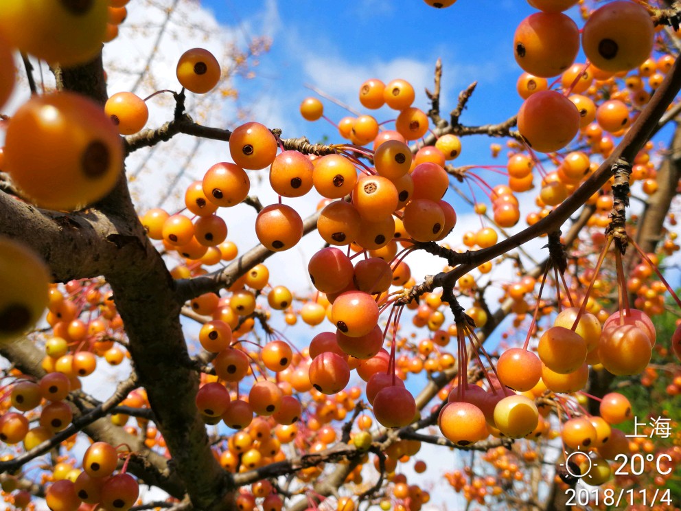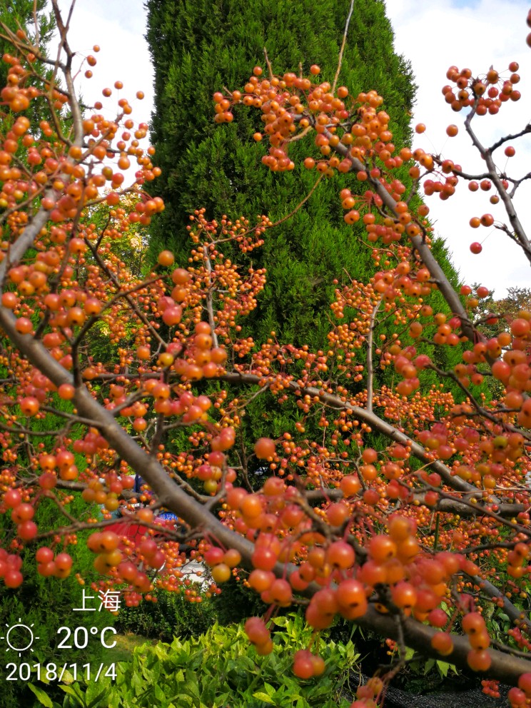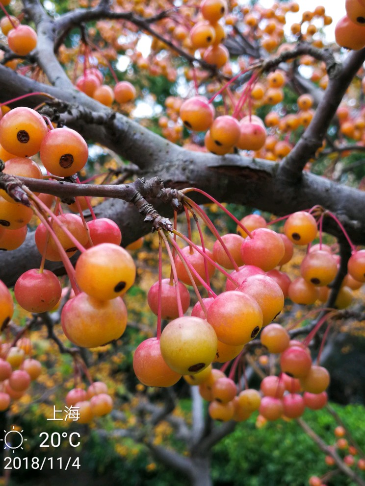 花花和果果贴一起,做个对比。免得大家只识其花,不认其果,或者反之。去年10月到11月我关注过几次路边的小海棠果(先不论其到底是什么海棠),满树密密麻麻,晶莹剔透,煞是好看。就开始惦记着其花到底是什么样。