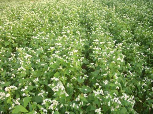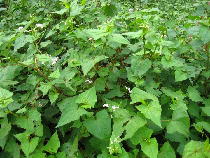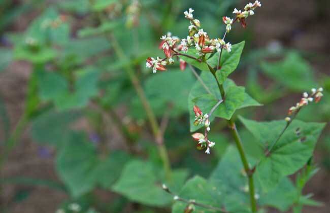 荞麦(学名:Fagopyrum esculentum Moench.),别名:甜荞、乌麦、三角麦等;一年生草本。茎直立,高30-90厘米,上部分枝,绿色或红色,具纵棱,无毛或于一侧沿纵棱具乳头状突起。叶三角形或卵状三角形,长2.5-7厘米,宽2-5厘米,顶端渐尖,基部心形,两面沿叶脉具乳头状突起。