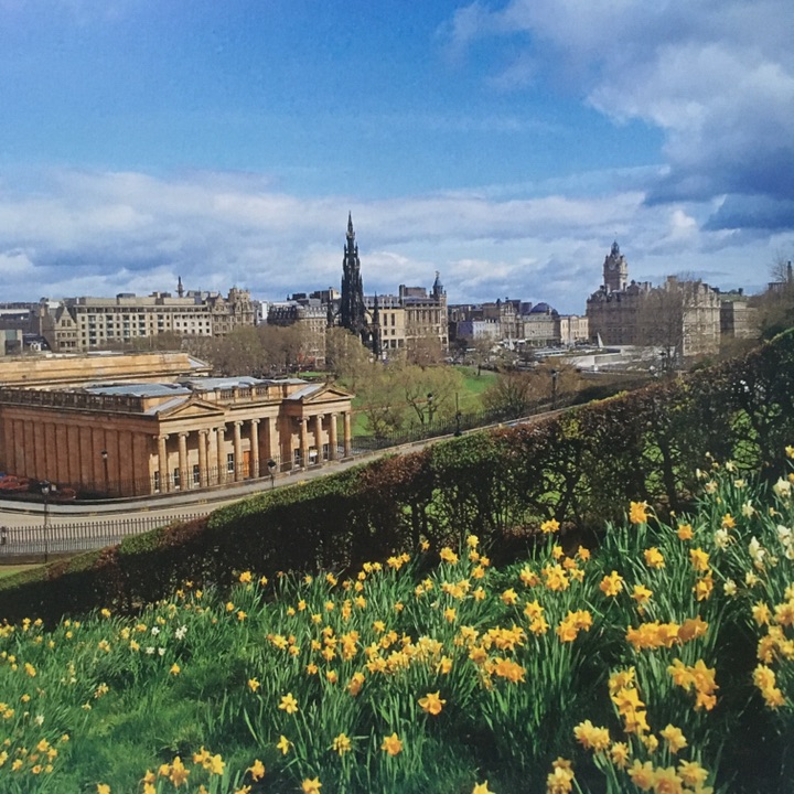 在爱丁堡市区的沃尔特·斯科特的个人纪念碑附近,有一个巨大的黄水仙花圃。在照片里你能看到那希腊式的古建筑,那是他们的老市政厅。后面黑钢的大教堂尖顶也若隐若现。山坡上的水仙花头此起彼伏,在风中摇曳着,荡起呼啦呼啦的声音。