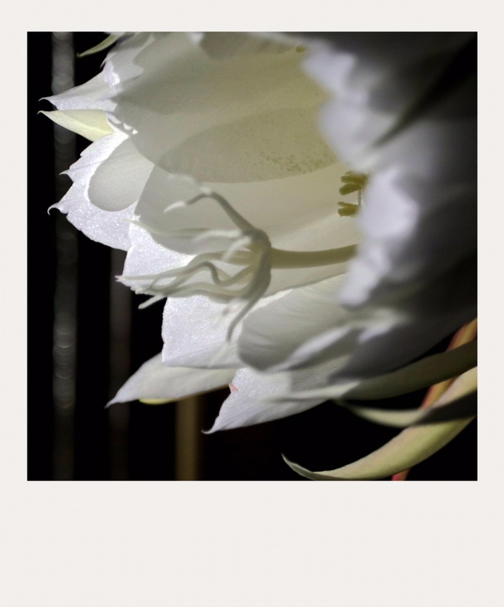 要求我们这群孩子(当年我也是本院孩子王)不去破坏他们家门口堆放的杂物,让这家的姐弟俩和我们一起去打野战,见到女主人小心翼翼地问好。终于通过他们的孩子婉述了我的小小心愿--昙花开的时候让我们大家一起看看。漫漫的暑期就要过完了,终于一天,他们家的女孩子告诉我说,她妈妈说这个晚上昙花会开,可以请我们去观赏。我激动万分,傍晚时分,早早催促母亲弄晚餐,并且在餐桌上宣布这一重大消息。父亲没说什么,母亲却以为我们不该晚上去打扰人家,说不让去,我反复抗争着,最后总算是得到了家长许可。我就盼着天能够快快地黑下来,这时候才觉得为什么白昼如此之长。等待是漫长的,六点、七点、八点,八点一个字、两个字、三个字,我从三楼到一楼,又从一楼到三楼来来回回,花就是没有一点儿开的迹象⋯⋯我在自家的厅里看着钟,期待着一楼小姐姐的召唤⋯⋯终于天亮了,我在等待中错过了昙花开放的时间。第二天早上起床后,他们家锁着门,外出了。父亲安慰垂头丧气的我,说还有明年不是,我想也是,日子长着呢。秋天就要到的时候,一楼那家突然就要搬走了,说是回省城,因为他们夫妇均为省城的大律师,哦,是大律师哦。以后再也未见,只记得主人姓庄。昙花就这样被尘封在记忆深处,直到三年前在厦门医高专的教学药圃里,我看到篱笆边上一棵植物,仿佛是昙花。一问园丁果然是,与我闲聊中,园丁折了一片叶子,说回去试着养养,种得好了三五年后就会开花啦。于是就有了这花⋯⋯
