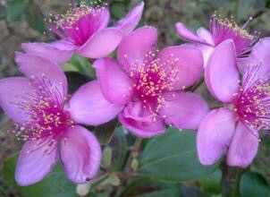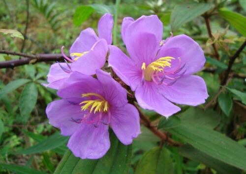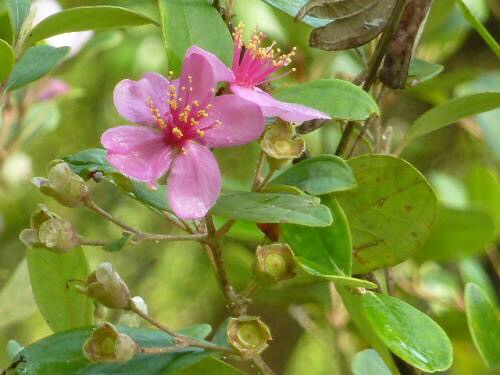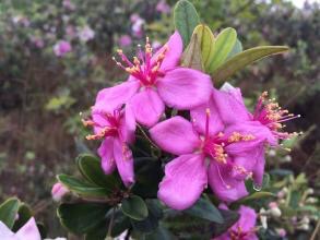 .桃金娘科、桃金娘属灌木,高可达2米;叶对生,革质,片椭圆形或倒卵形,花常单生,紫红色,萼管倒卵形,萼裂片近圆形,花瓣倒卵形,雄蕊红色,浆果卵状壶形,熟时紫黑色;花期4-5月。夏日花开,绚丽多彩,灿若红霞,边开花边结果。成熟果可食,也可酿酒,是鸟类的天然食源。用于园林绿化、生态环境建设、是山坡复绿、水土保持的常绿灌木。果可食用,全株供药用,有活血通络,收敛止泻,补虚止血的功效。