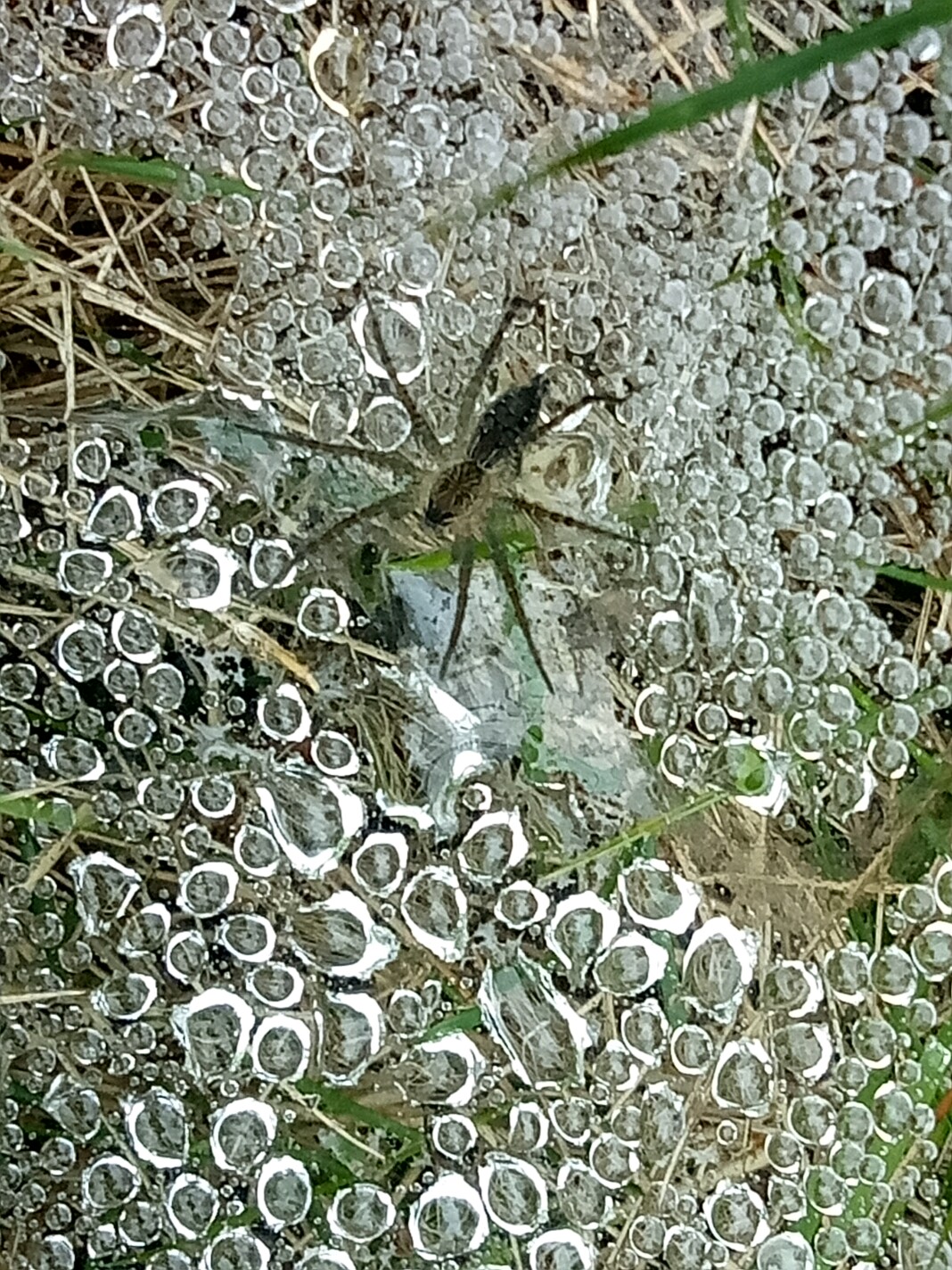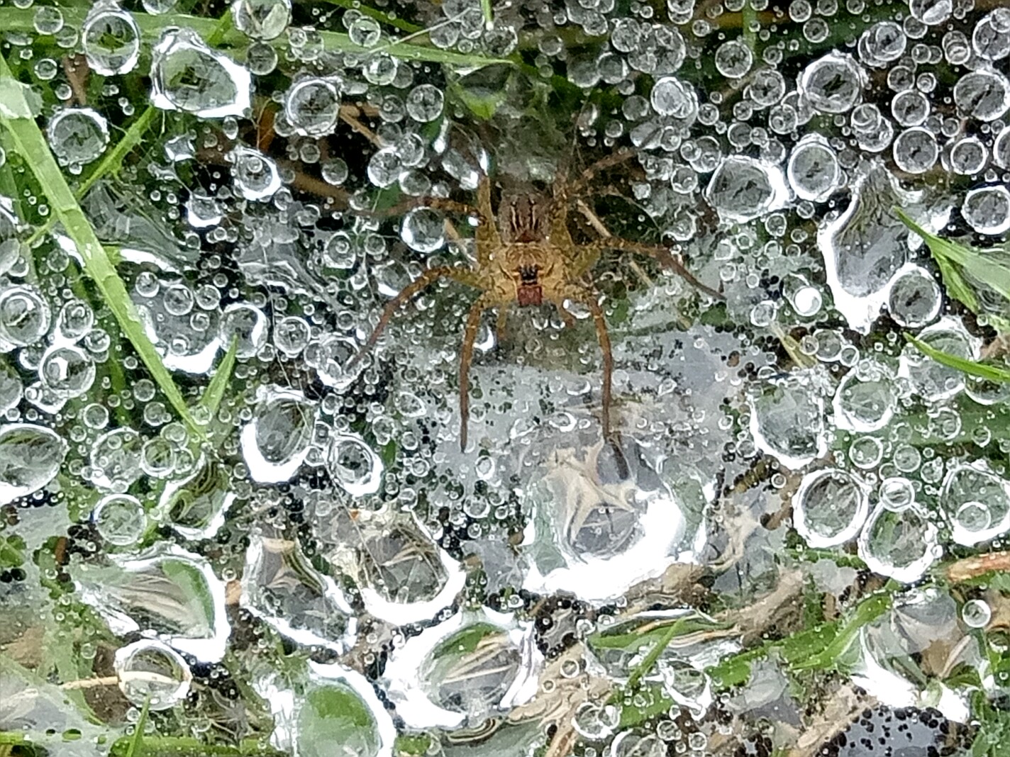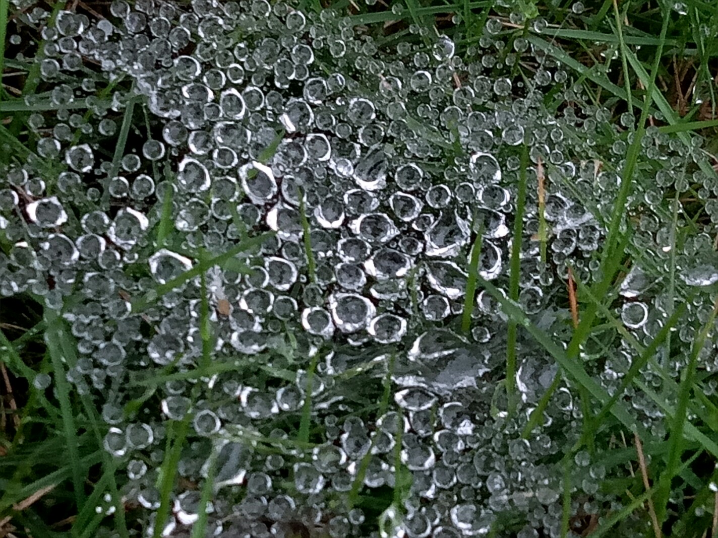 蜘蛛草地织网捕猎物,猎物没来,却来了一网碧珠。
