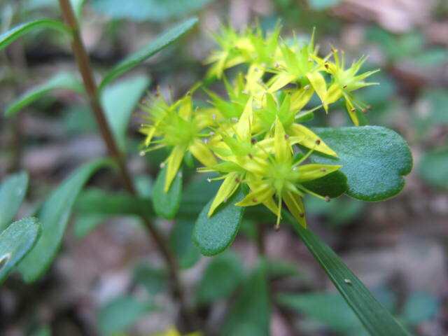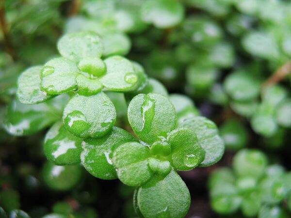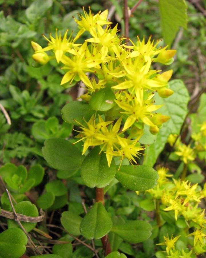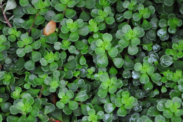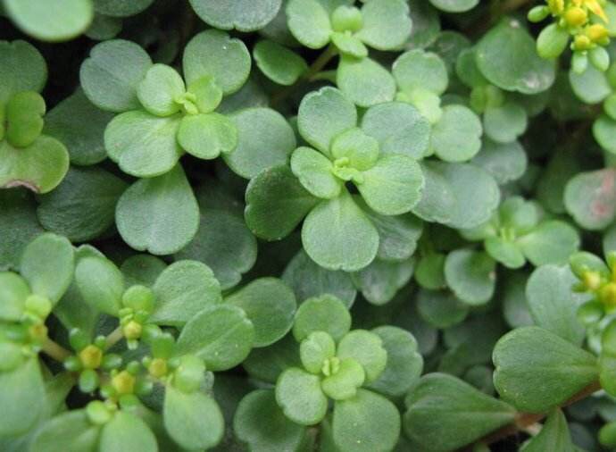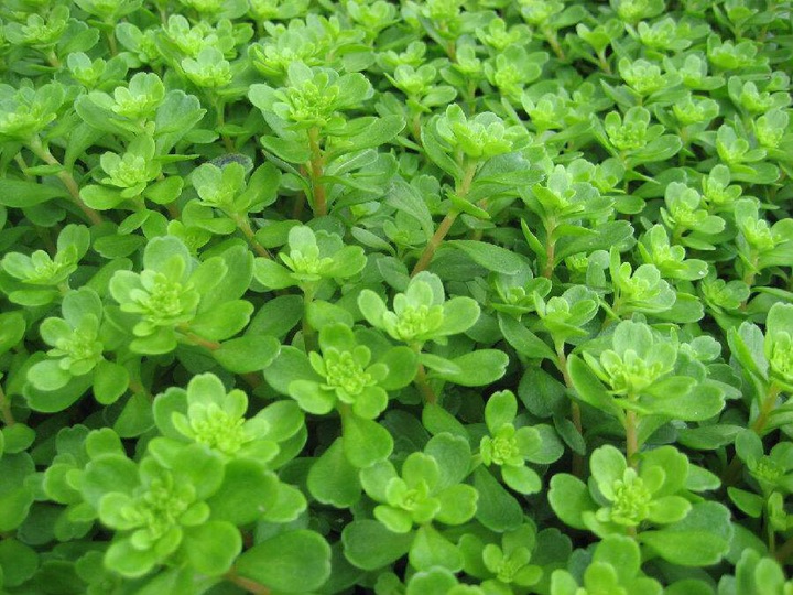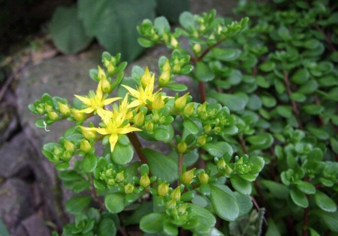 凹叶景天(拉丁文名:Sedum emarginatum Migo)别名:石板菜、九月寒、打不死、石板还阳、石雀还阳、岩板菜.景天科景天属多年生草本植物。茎节的下部平卧于地面或地下、节上生有不定根;上部直立,淡紫色,略呈四棱形;叶片顶端圆而且有一个凹陷;枝叶密集如地毯,花较小,黄色,着生在花枝的顶端。