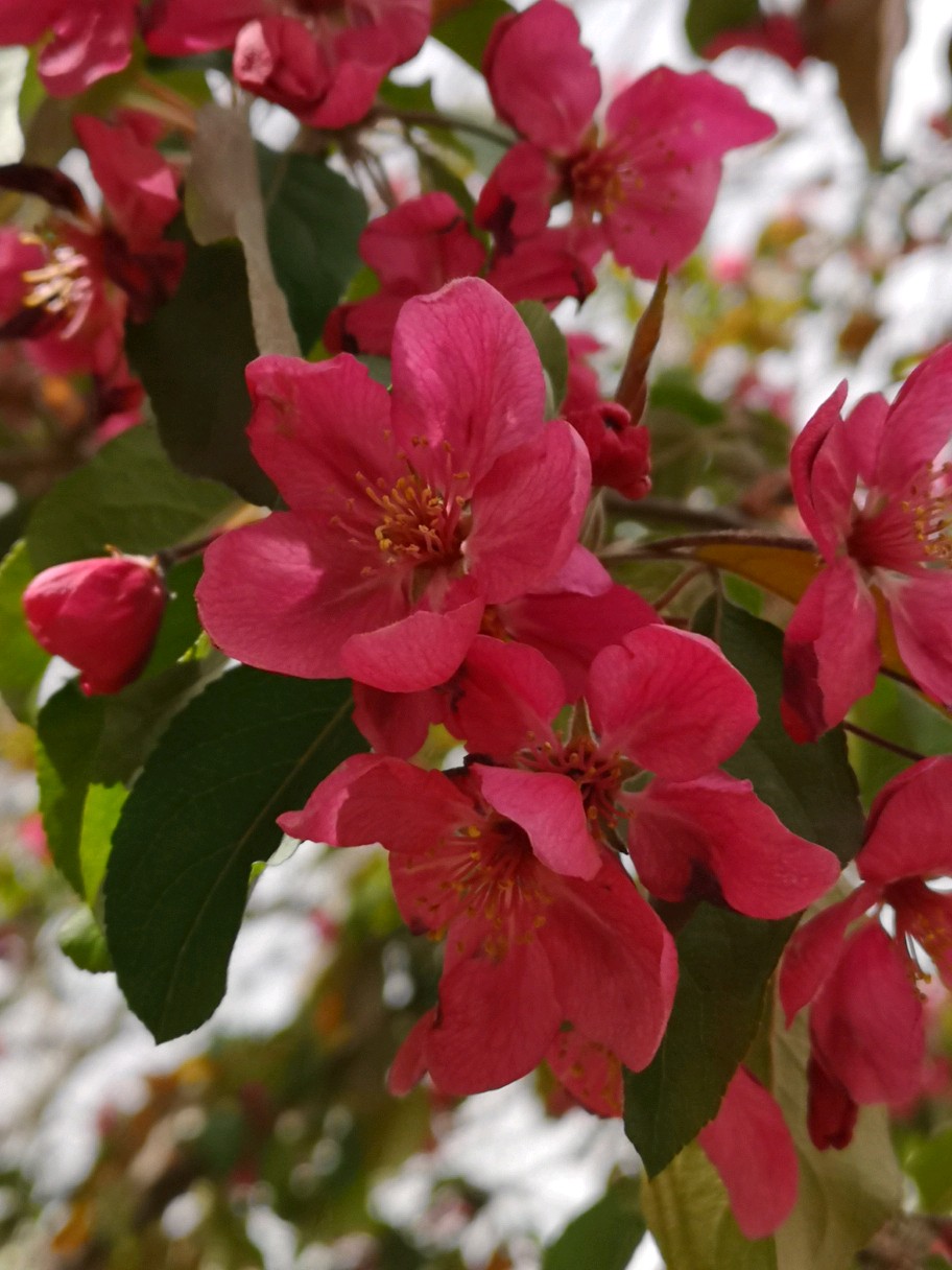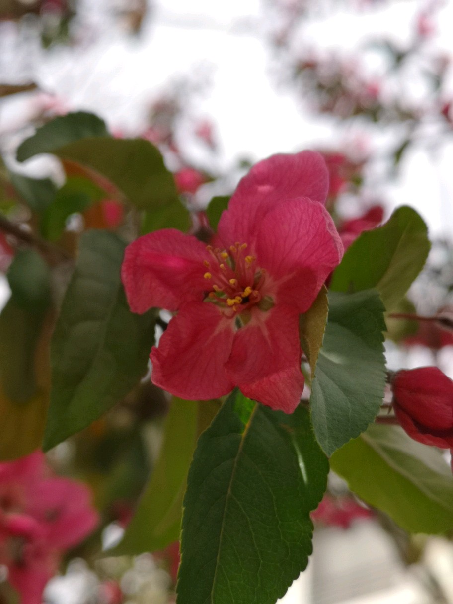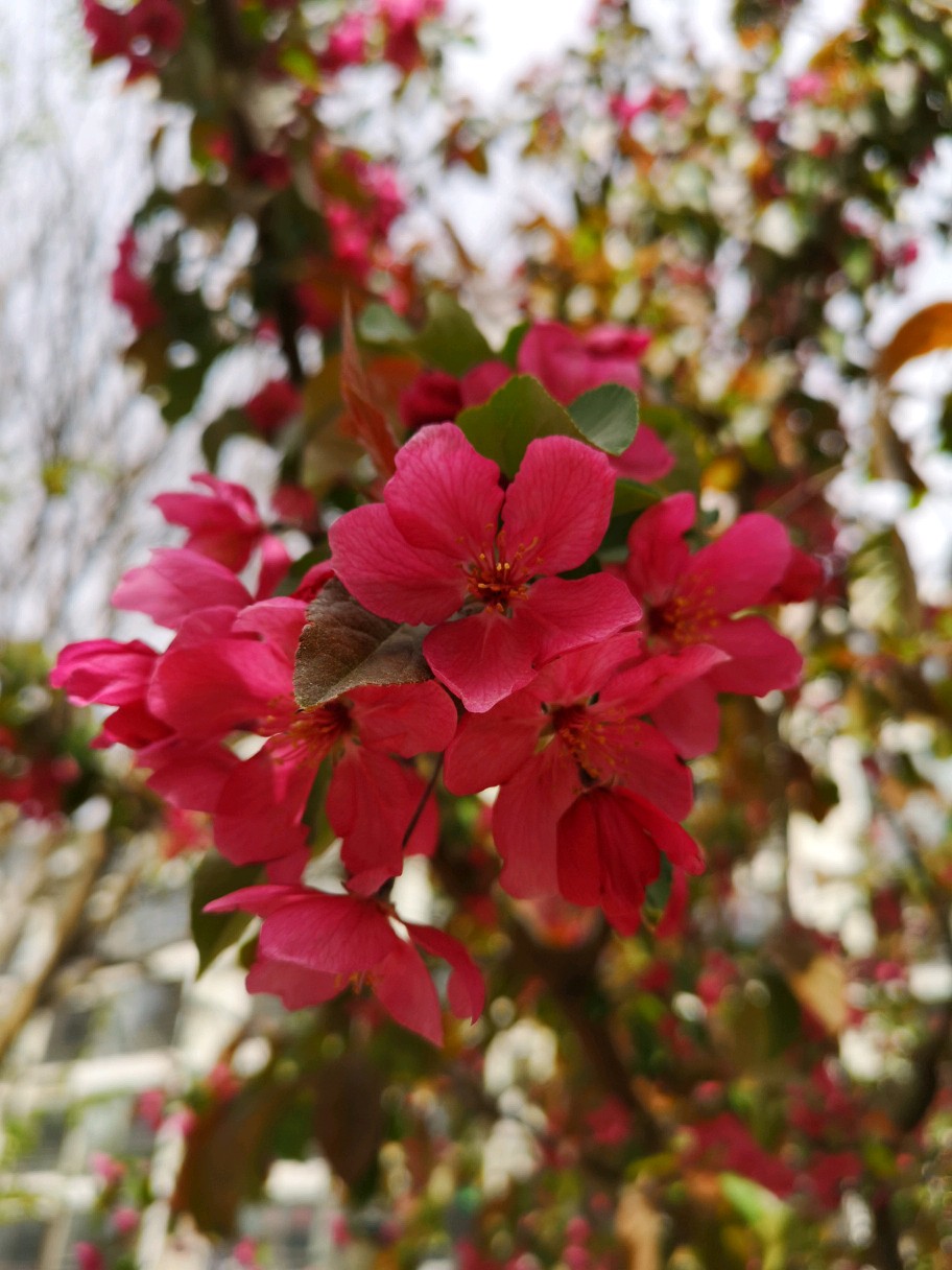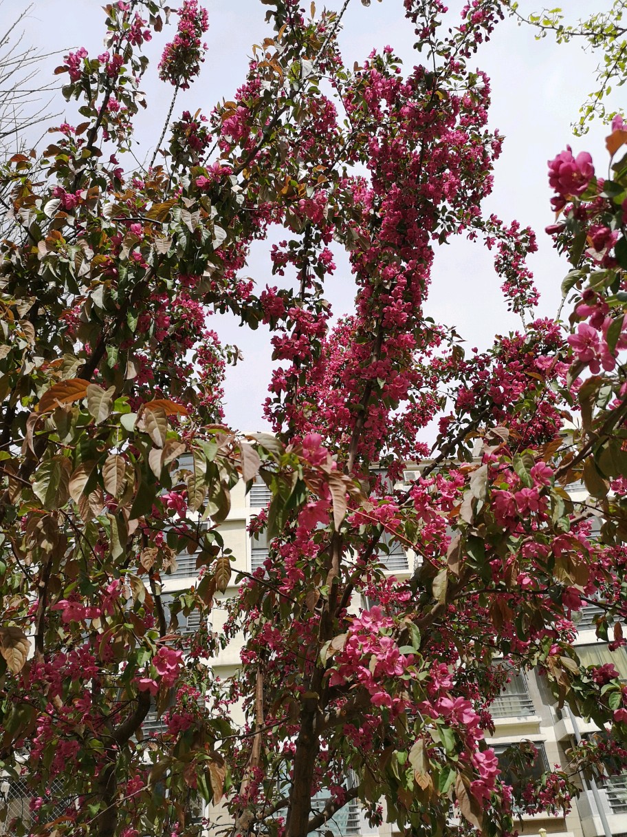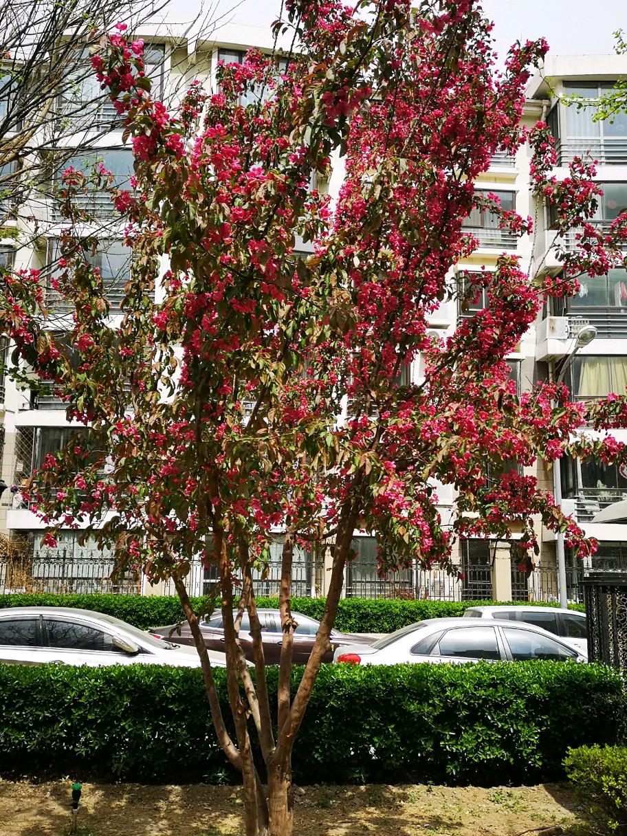 路过临近的小区,偶遇一棵盛开的海棠,深红色的,不多见。