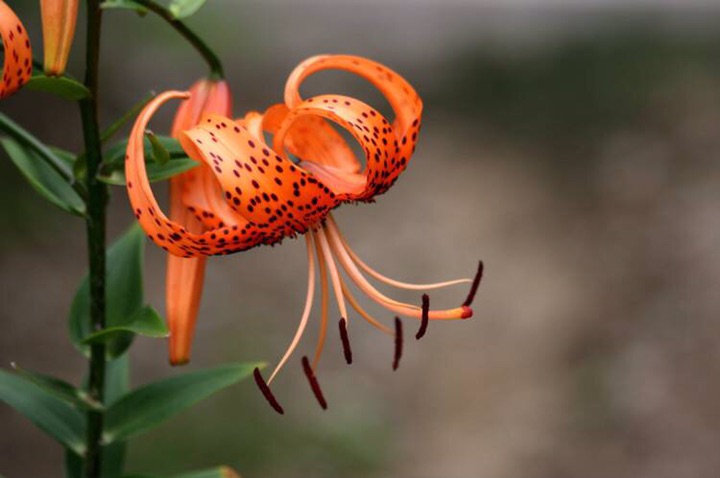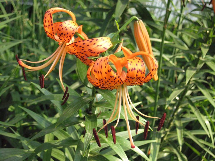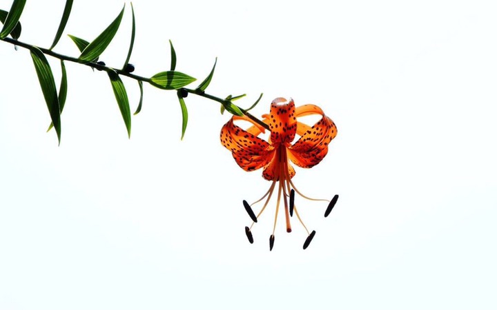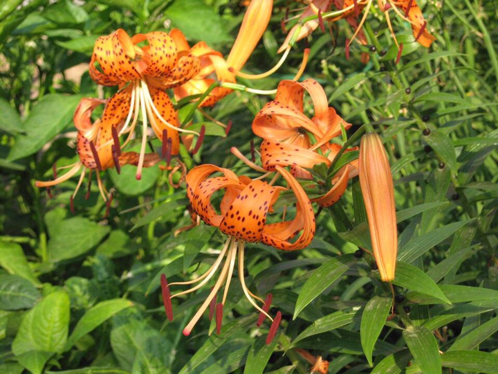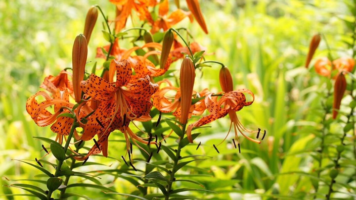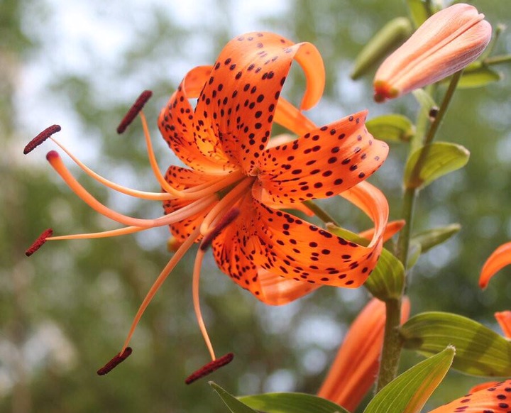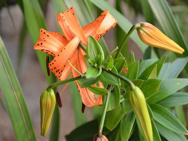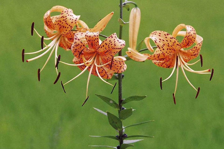 卷丹(学名:Lilium lancifolium Thunb.):卷丹花瓣有平展的,有向外翻卷的,故有“卷丹”美名。鳞茎近宽球形,高约3.5厘米,直径4-8厘米;鳞片宽卵形,长2.5-3厘米,宽1.4-2.5厘米,白色。茎高0.8-1.5米,带紫色条纹,具白色绵毛。叶散生,矩圆状披针形或披针形,两面近无毛,有5-7条脉。花3-6朵或更多;苞片叶状,卵状披针形;花下垂,花被片披针形,反卷,橙红色,有紫黑色斑点。蒴果狭长卵形,长3-4厘米。