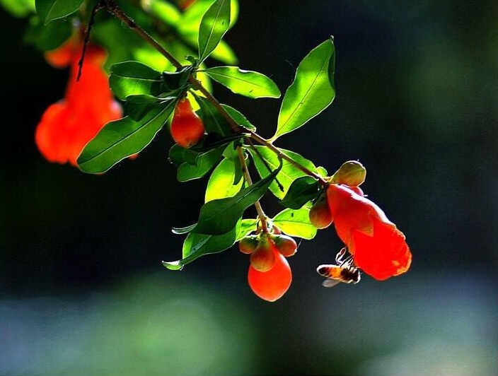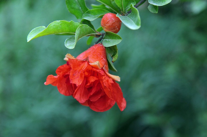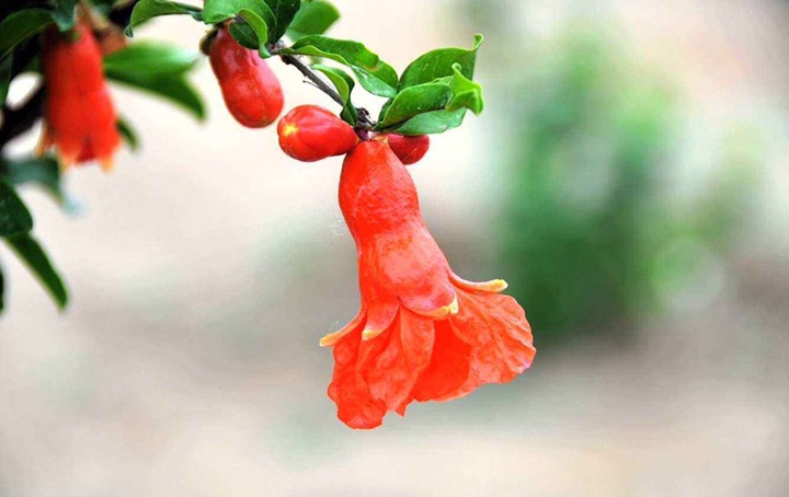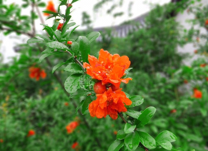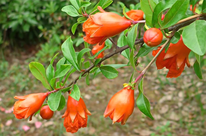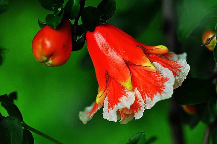 石榴花,落叶灌木或小乔木石榴的花;为石榴属植物,石榴树干灰褐色,有片状剥落,嫩枝黄绿光滑,常呈四棱形,枝端多为刺状,无顶芽。石榴花单叶对生或簇生,矩圆形或倒卵形,新叶嫩绿或古铜色。花朵至数朵生于枝顶或叶腋,花萼钟形,肉质,先端6裂,表面光滑具腊质,橙红色,宿存。